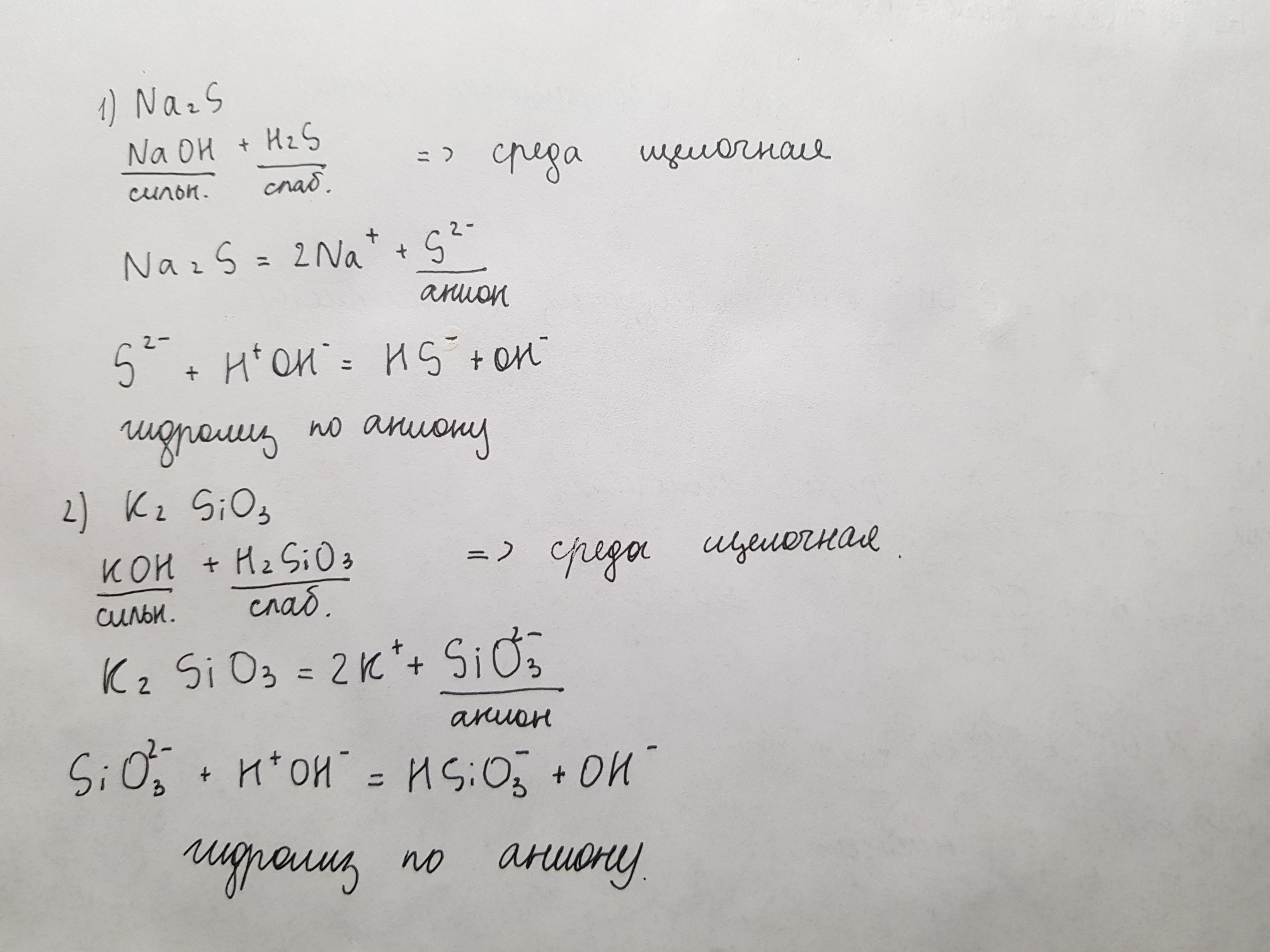 Составьте ионное уравнение гидролиза и определите характер среды в растворах сульфида натрия,силиката калия,карбоната калия.