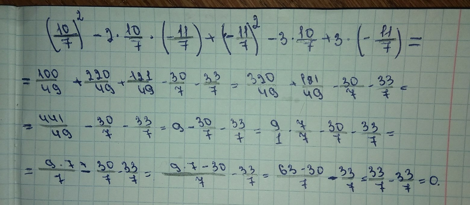 вычислите значение выражения a^2-2ab+b^2-3a+3b при а=10/7; b=-11/7