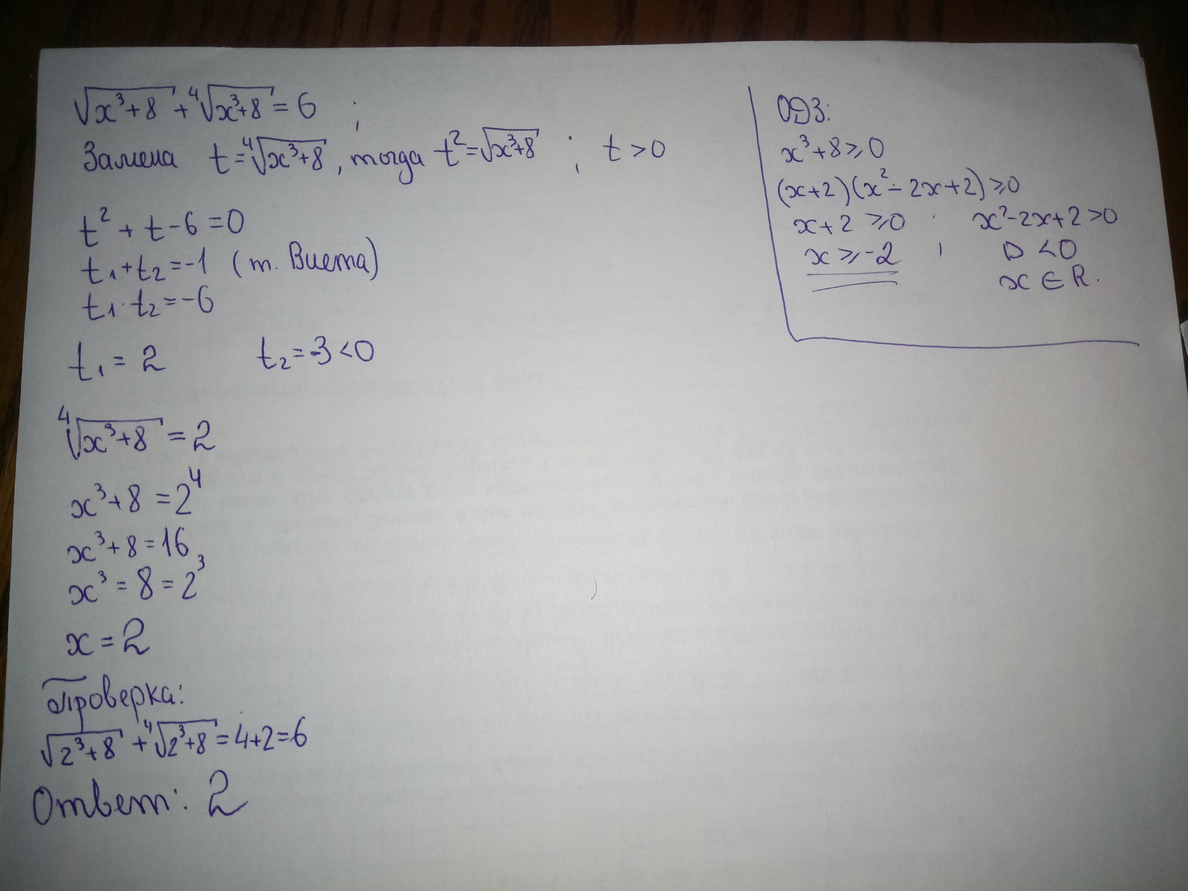 Корень(x^3+8)+Корень[4 степень](x^3+8)=6