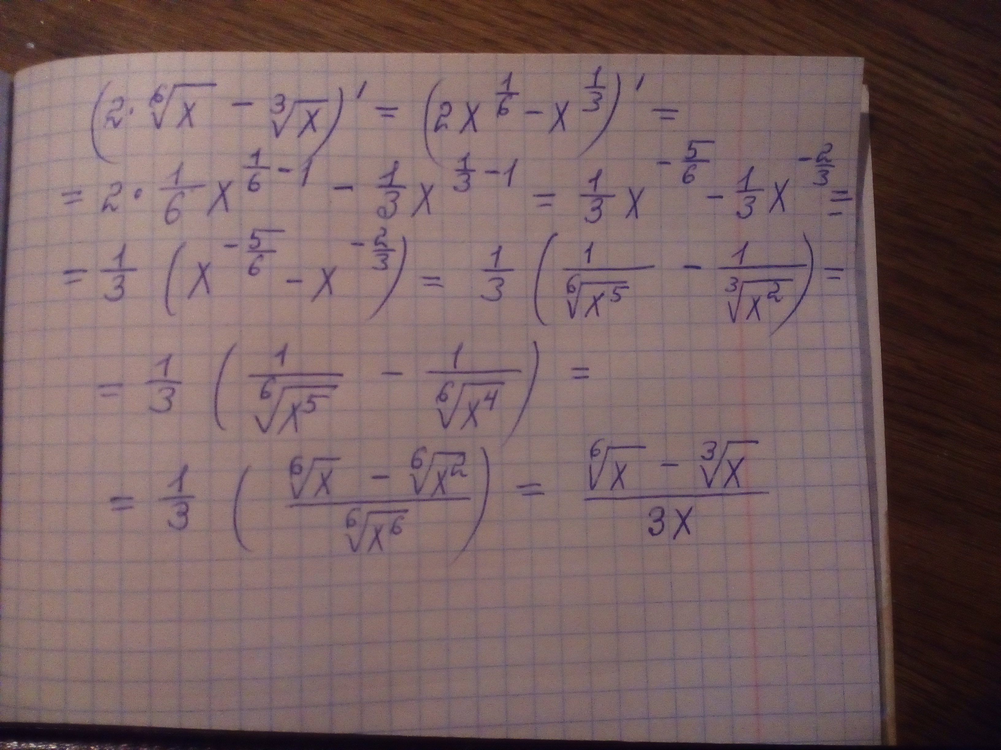 производная функции: 2 * 6(степень) корня из X - 3(степень) корня из X. (Пожалуйста помогите, буду благодарен).
