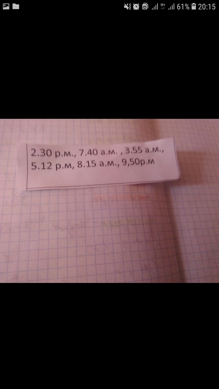 2.30 вечера,5.30 вечера,7.40 утра,8.15 утра,3.55 утра,9.50 вечера