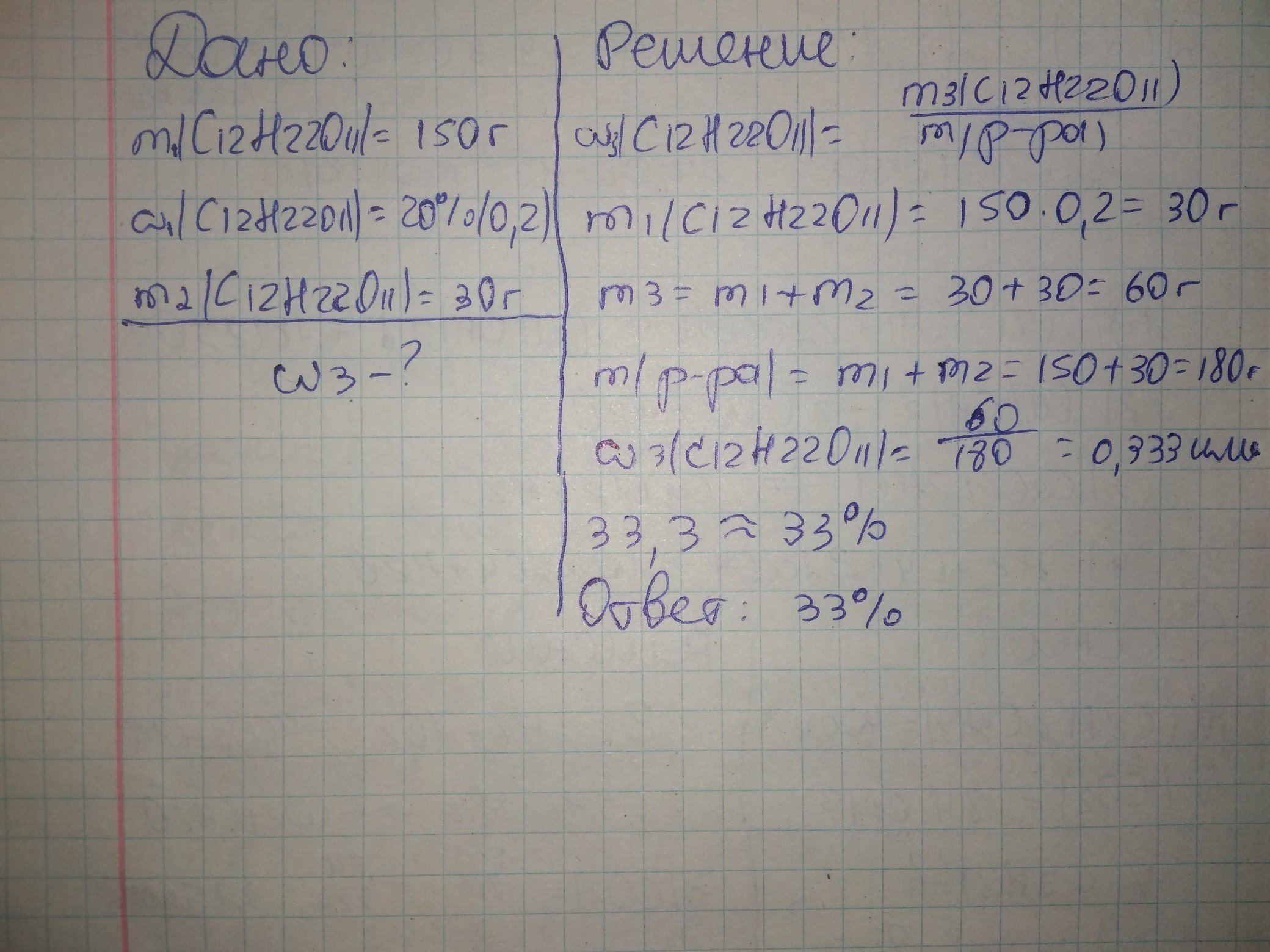 К 150%г 20%-го раствора сахара добавили 30г сахара.Найдите массовую долю вещества в полученном растворе