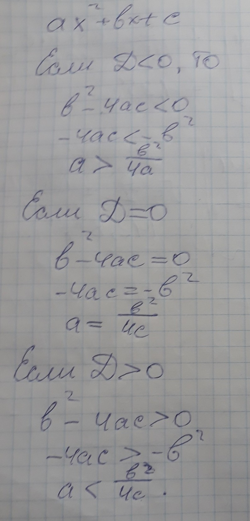 как связан знак квадратного трехчлена ax^2+bx+c cо знаком коэффициента "a" при D<0,D=0,D>0