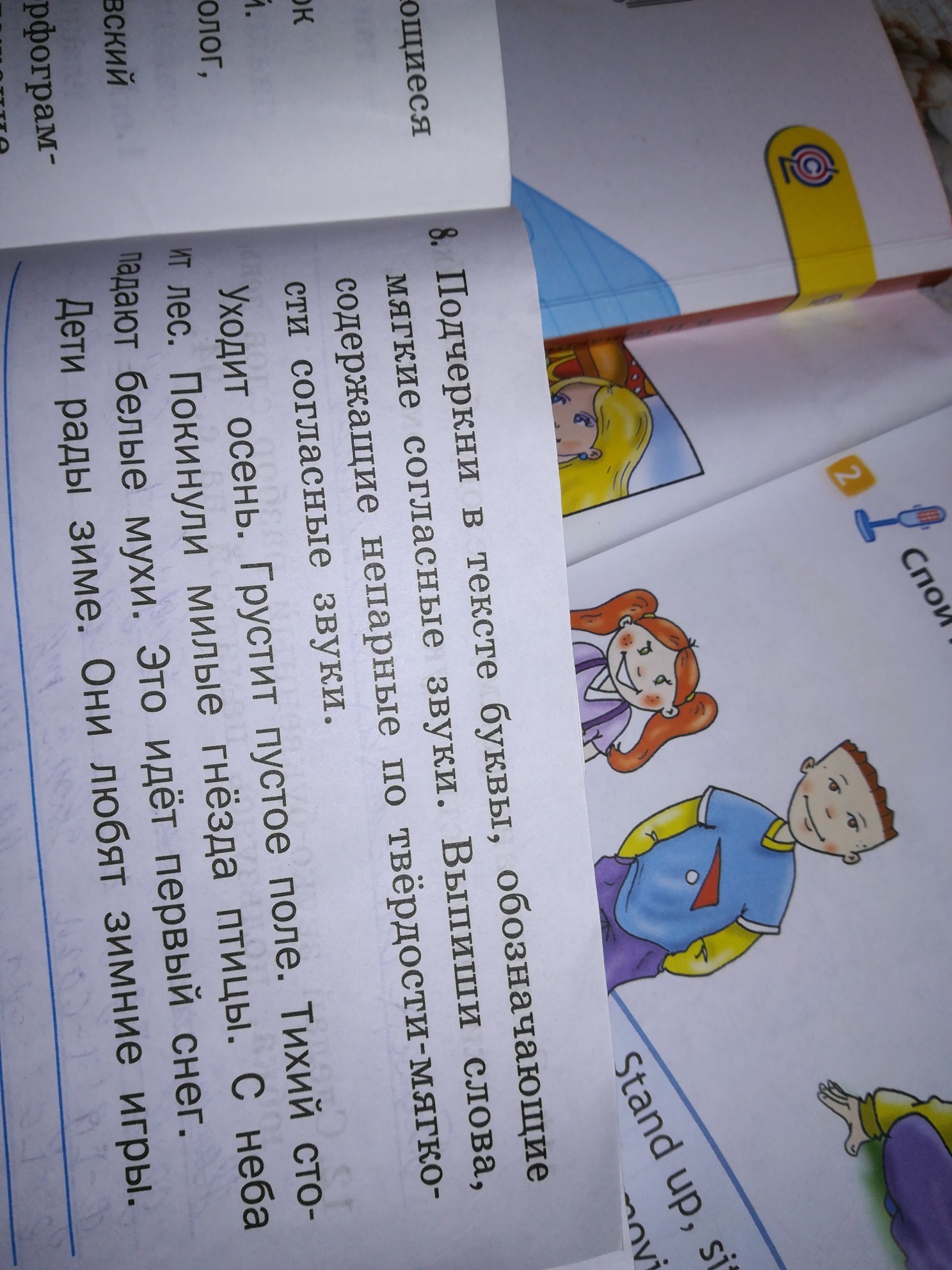 Уходит осень. Грустит пустое поле. Тихий стоит лес. Покинули милые гнёзда птицы. С неба падают белые мухи. Это идёт первый снег.