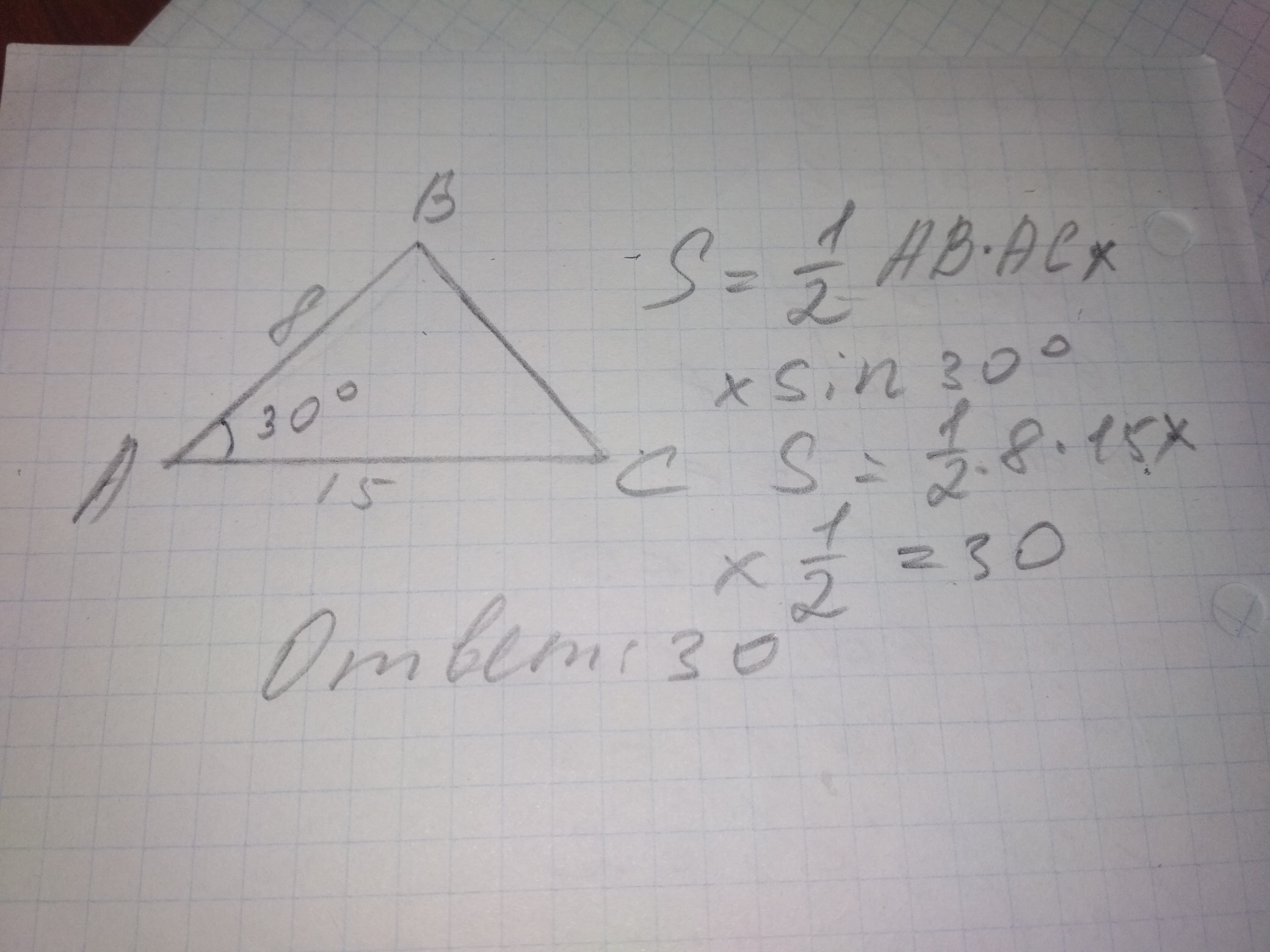 ABC-треугольник, угол A-30°,AC-15,AB-8.Найти площадь ABC
