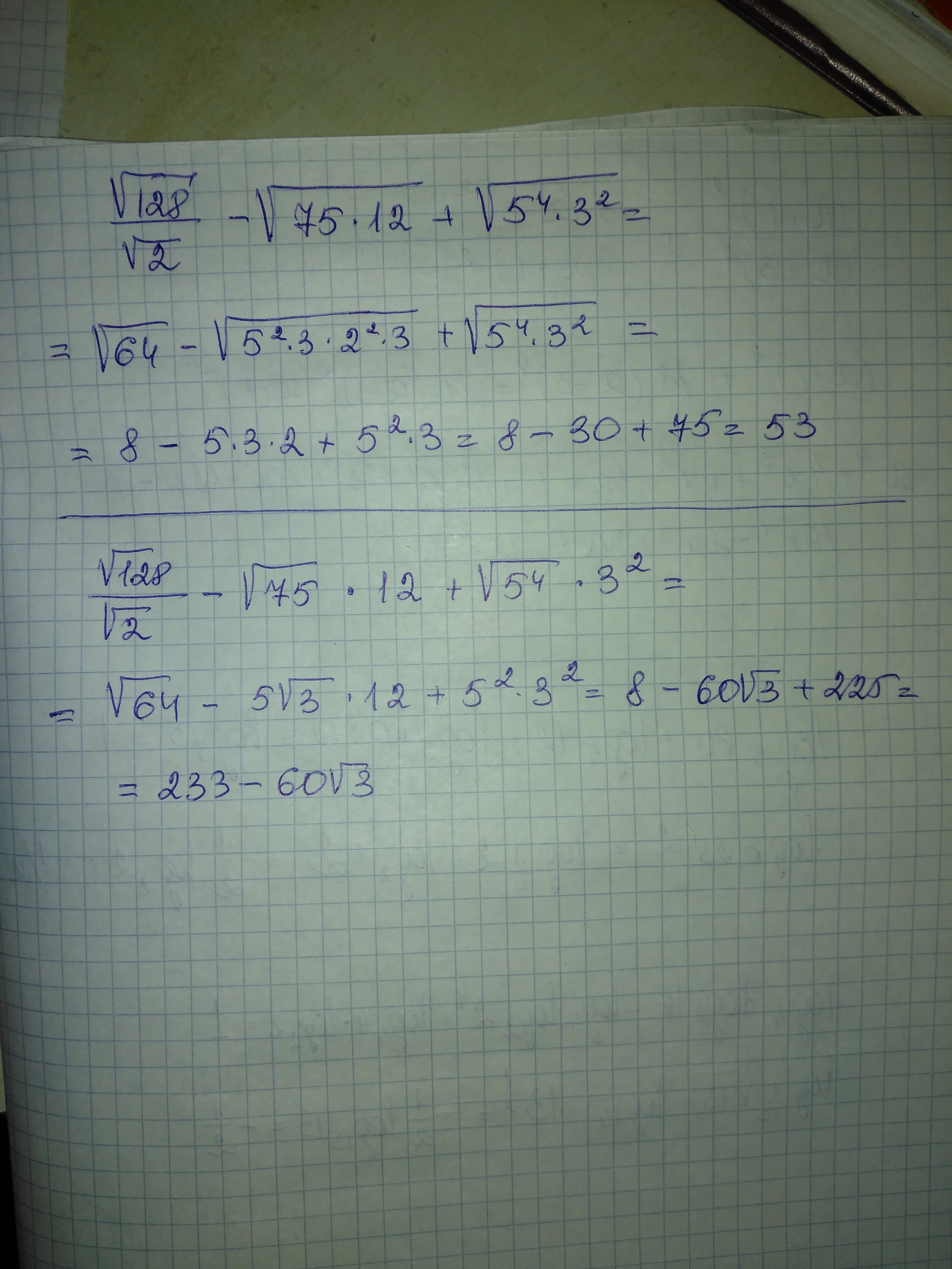 найти значение выражения: корень 128/корень 2-корень*12+корень 5^4*3^2