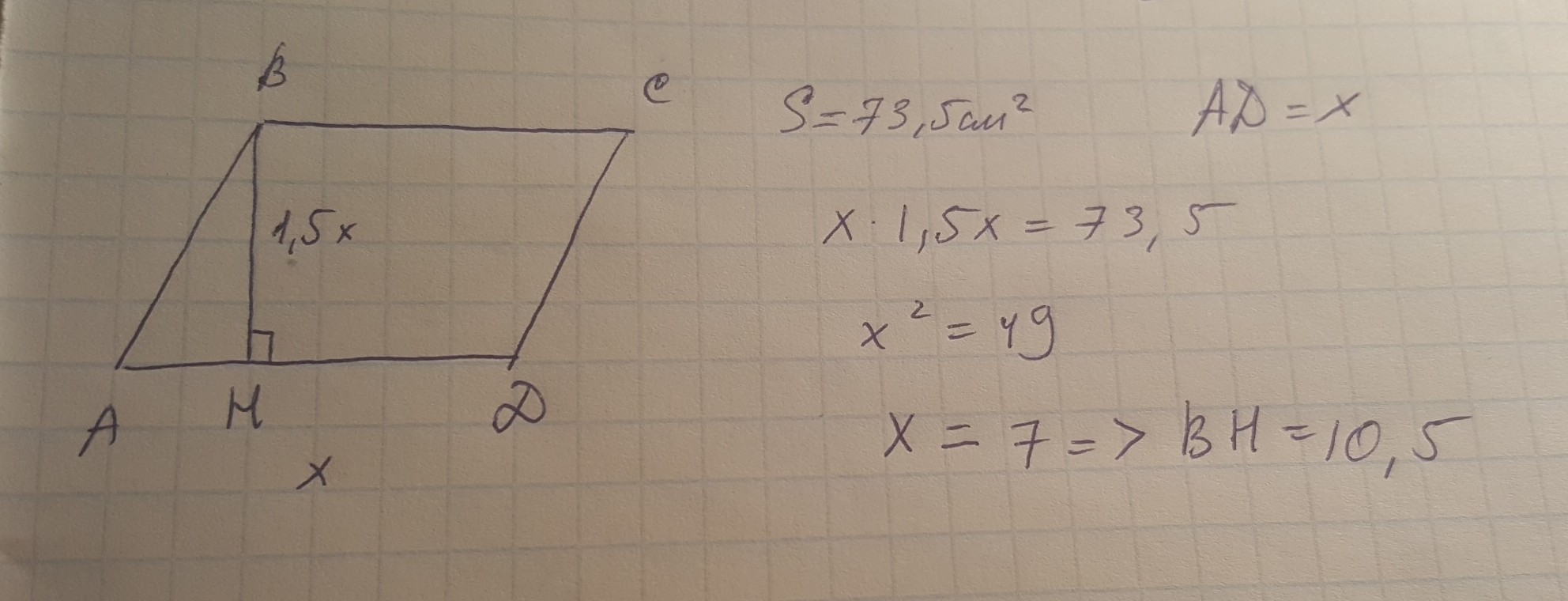 найдите высоту параллелограмма если его площадь равна 73,5 см а сторона к которой провелена высота ,в 1,5 раза больше этой стороны