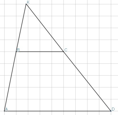 продолжение боковых сторон ab и cd трапеции abcd пересекаются в точке k . большее основание ад трапеции равно 18 см, ак=24см ав=16см. найдите меньшее основание трапеции