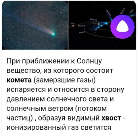 При приближении к Солнцу вещество, из которого состоит комета (замерзшие газы) испаряется и относится в сторону давлением солнечного света и солнечным ветром (потоком частиц) , образуя видимый хвост - ионизированный газ светится