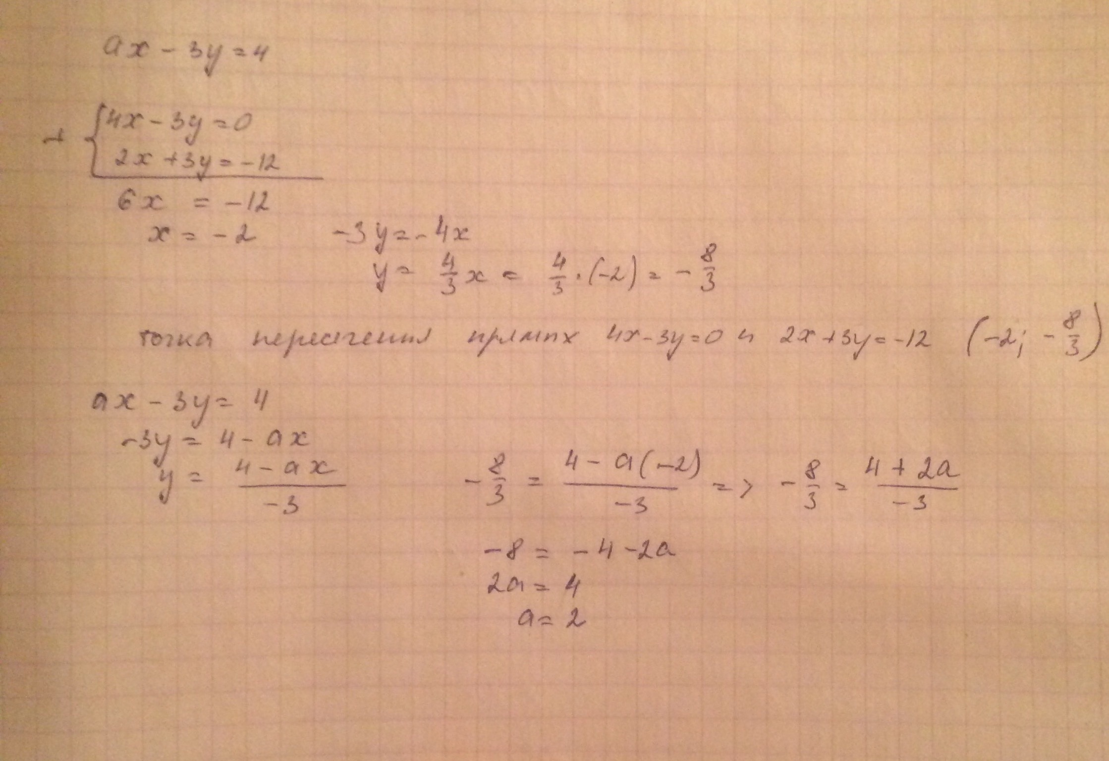 прямая ах-3у=4 проходит через точку пересечения прямых 4х-3у=0 и 2х+3у=-12.Найдите b