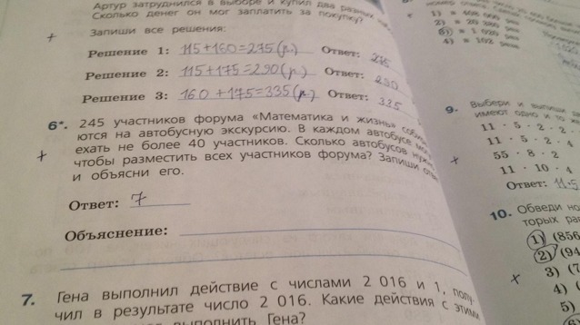 Так как в 6 автобусов поместятся 240 человек, а участников форума всего 245, то для оставшихся 5 человек тоже нужен автобус. Всего нужно 7 автобусов.
