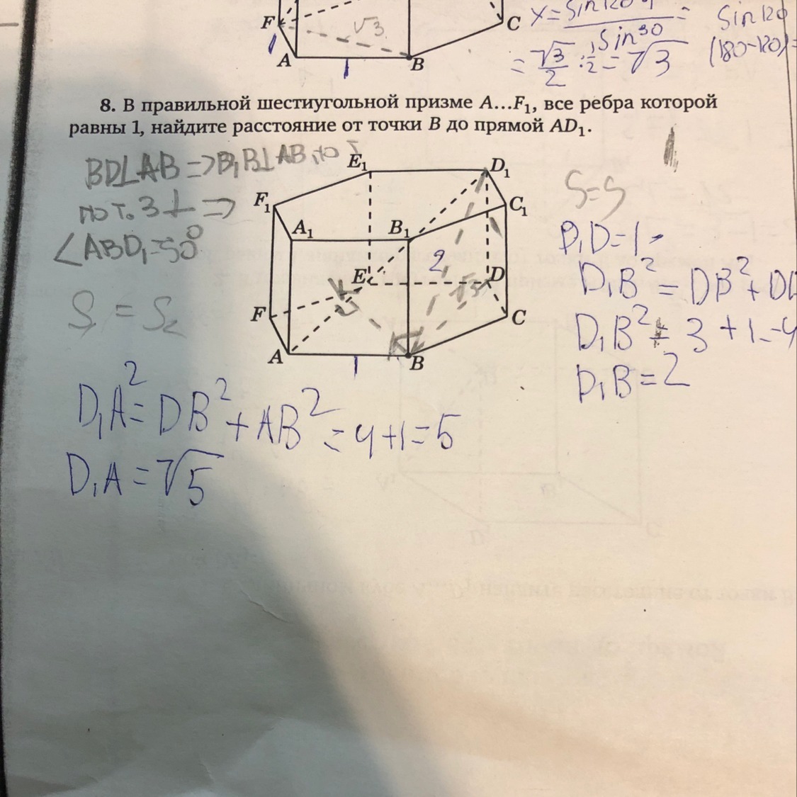 В правильной шестиугольной призме A...F1 все рёбра которой равны 1, найдите расстояние от точки B до прямой AD. Чертёж выше.