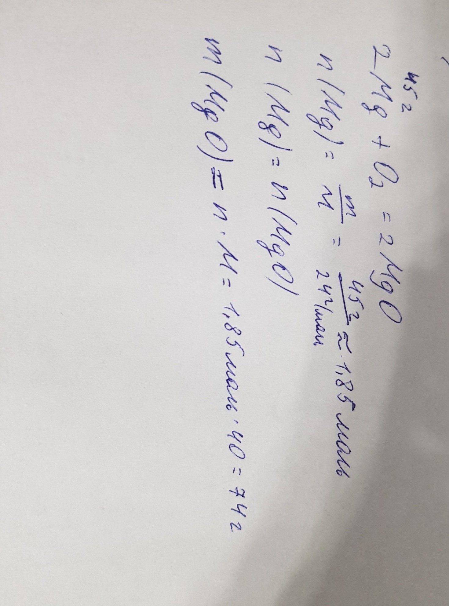 рассчитайте массу оксида магния который образуется на 45г магния по уравнению 2Mg+O2=2MgO