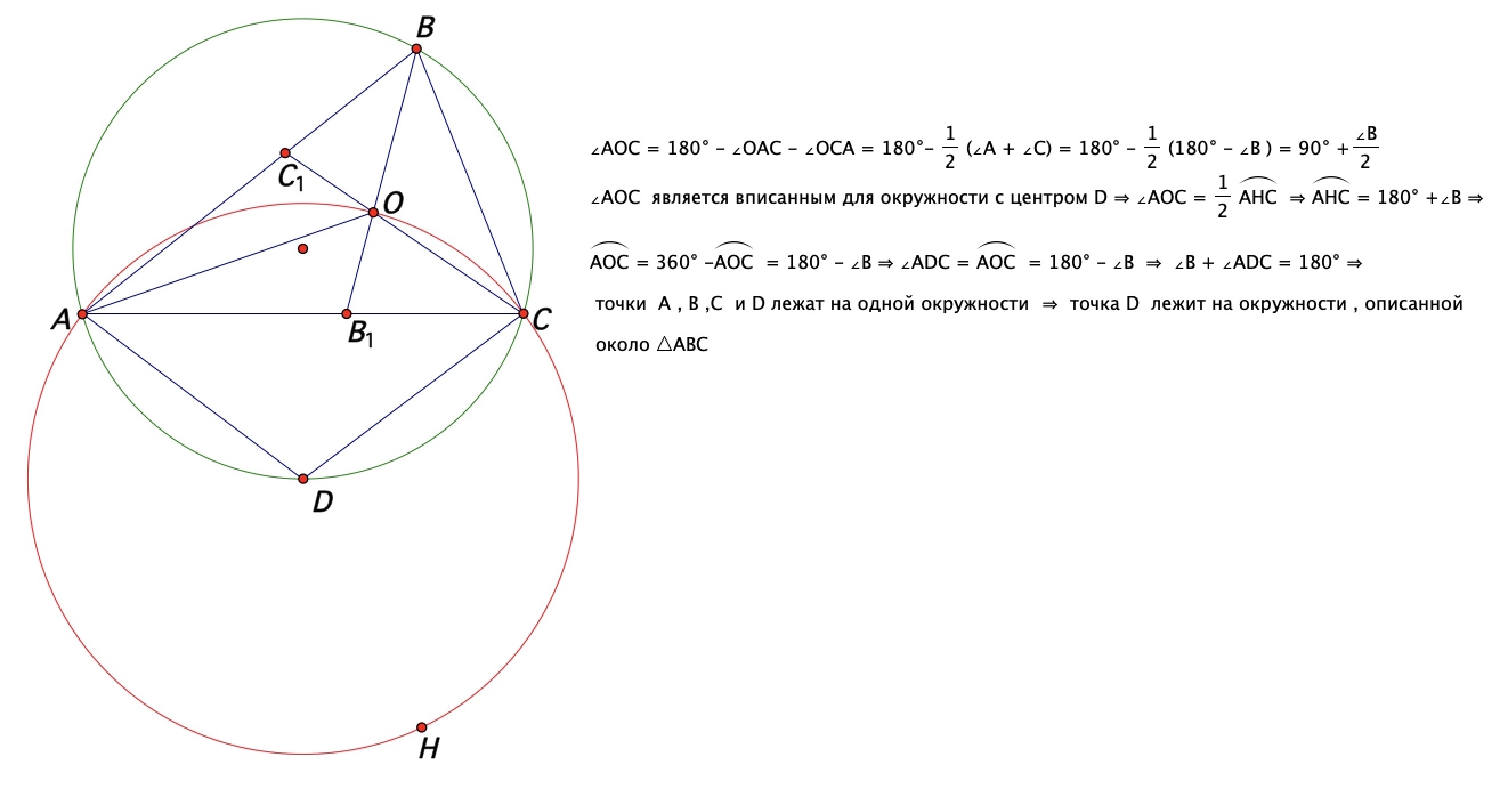в треугольнике ABC биссектрисы BB1 и CC1 пересекаются в точке O ,а точка D-центр окружности описаной около треугольника AOC. Докажите,что точка D лежит на окружности описанной около треугольника ABC.