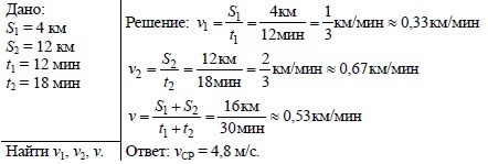 Автобус первые 4 км проехал за 12 минут, а следующие 12 км за 18 минут. Какова средняя скорость автобуса на каждом участке и на всем пути?