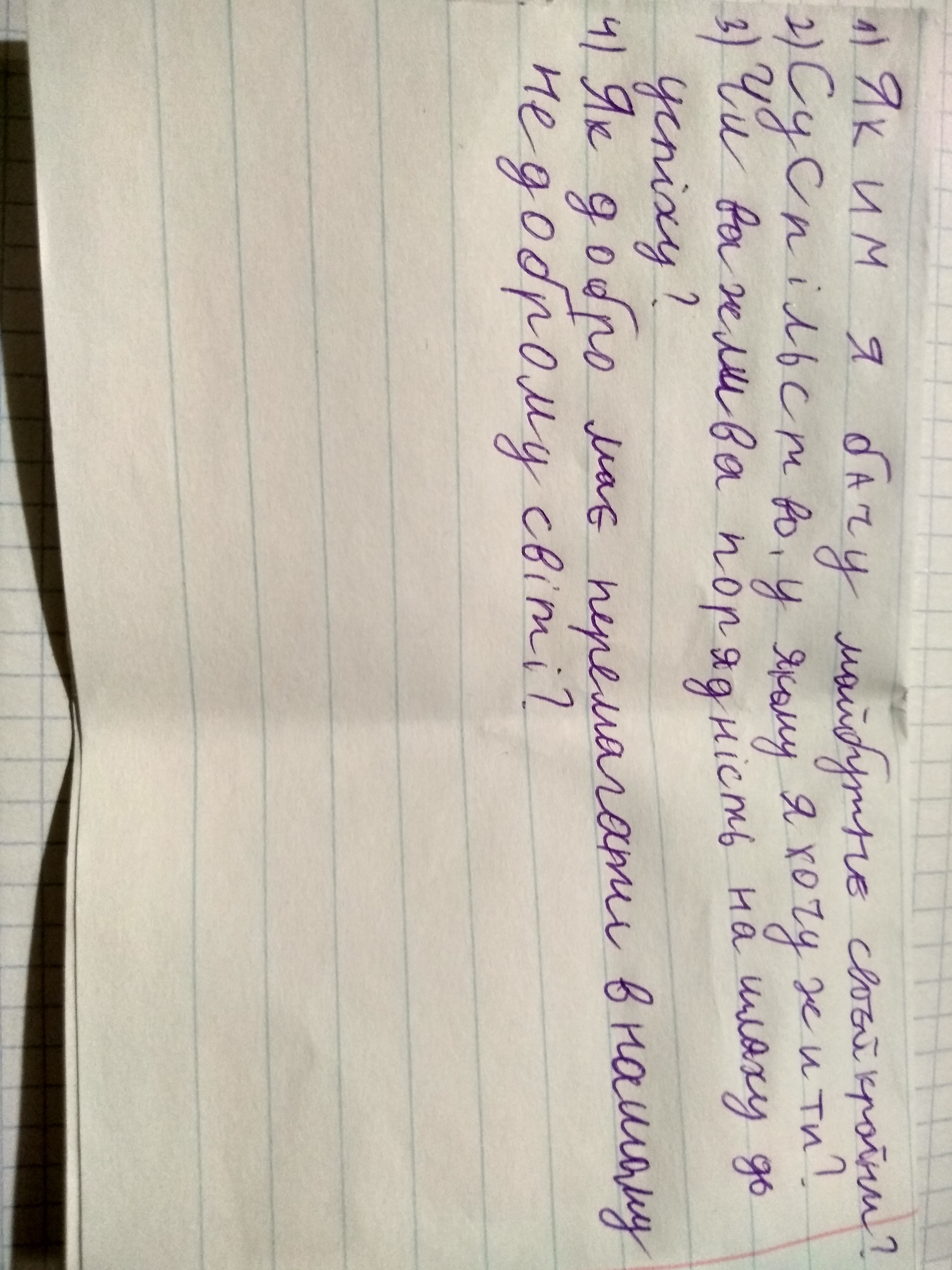 На мою думку, серед людей різних національностей дуже багато спільного: усі хочуть спокою, домашнього затишку, гарної роботи, спокійної старості. Прикро, що самі ж українці про себе склали приказку: "Де два українці, там три гетьмани" (інший варіант: "Де два українці, там три партії"). Це свідчить про те, що нам ще тривалий час доведеться слухати політичну балаканину та вихваляння наших політичних лідерів, а потім таки братися до наведення ладу у своїй власній хаті