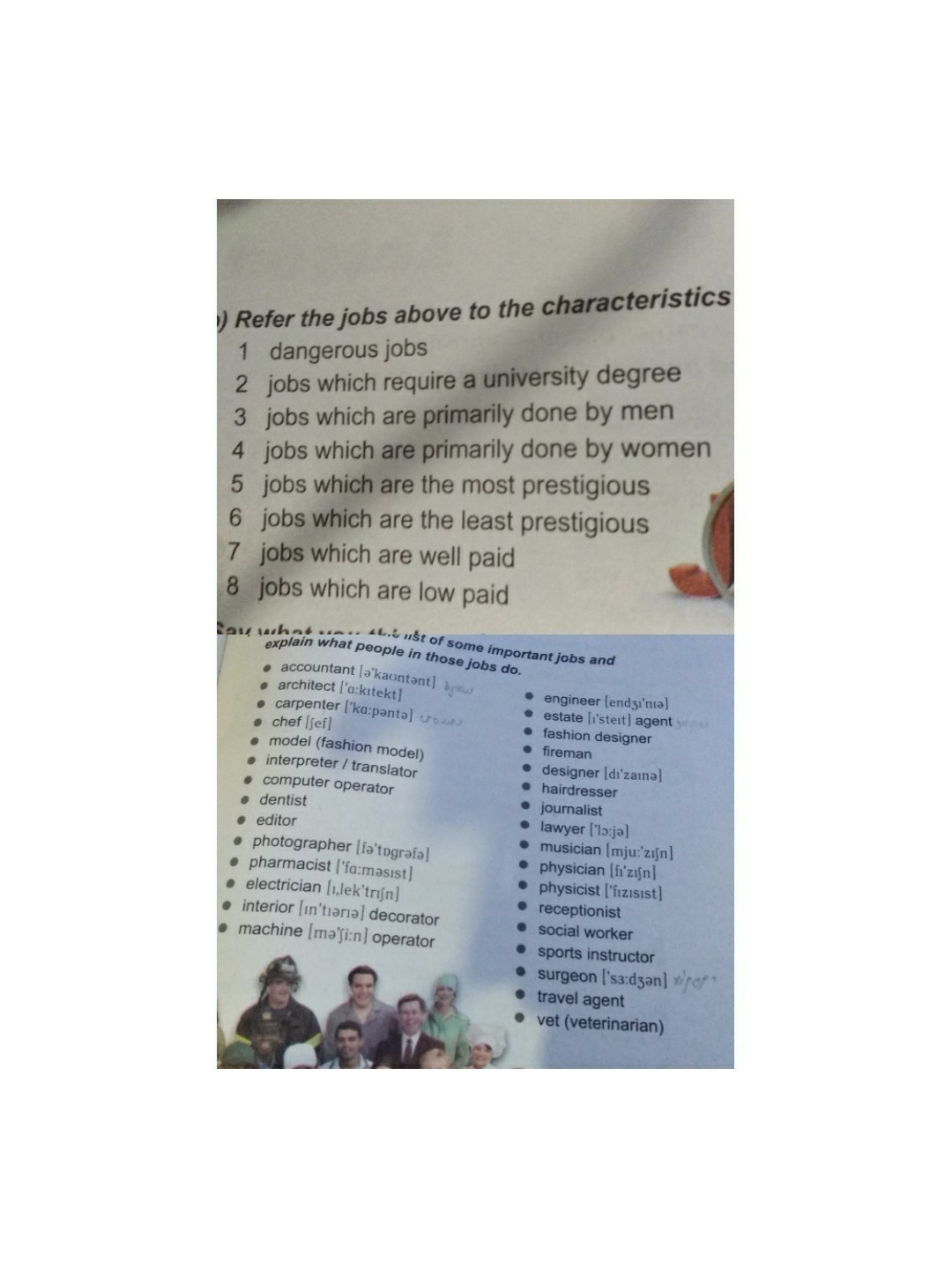 1. electrician, fireman 2. architect, dentist, physician, lawyer 3. carpenter, electrician, fireman 4. hairdresser, accountant 5. lawyer, surgeon, architect 6. social worker, vet, editor 7. lawyer, model, dentist 8. vet, carpenter, computer operator