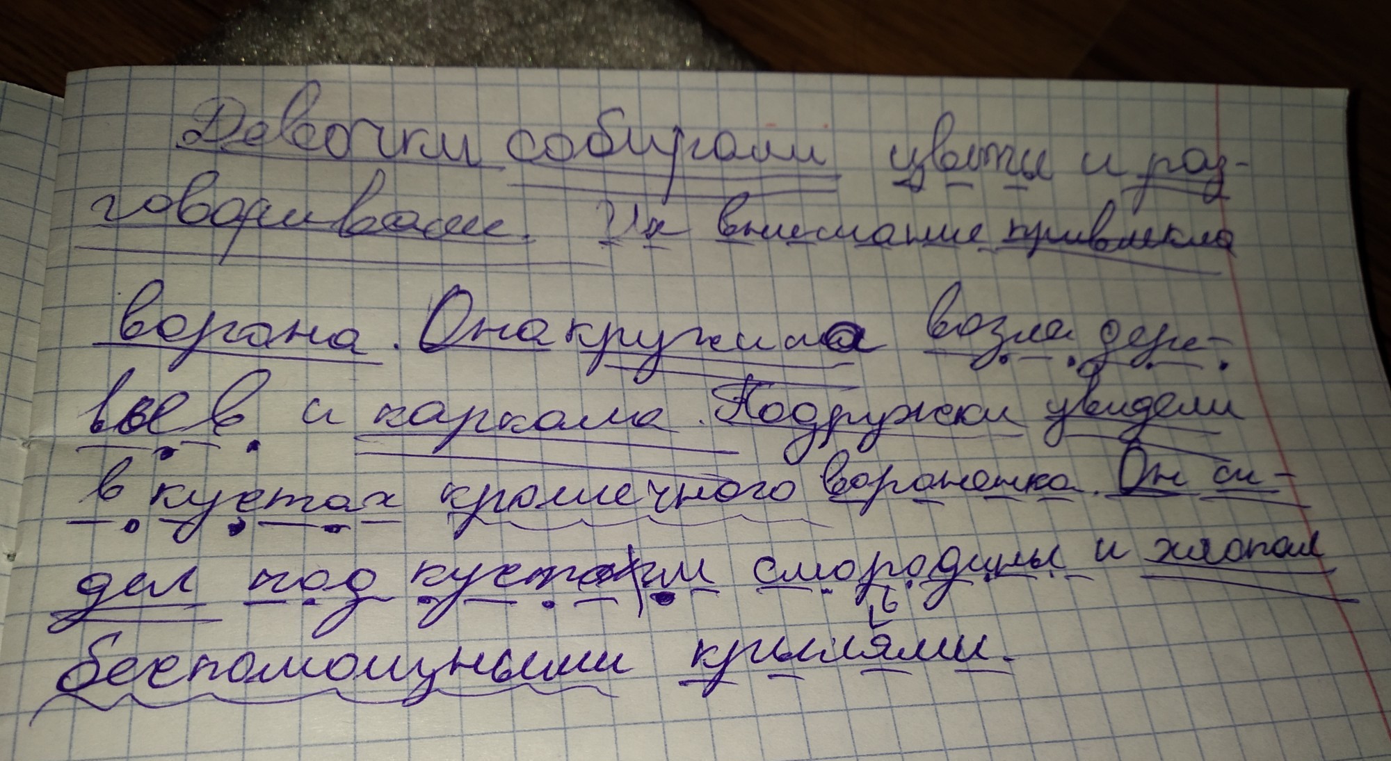 Подчеркни главные и второстепенные члены предложения. К предложениям с одноподными членами изобрази схемы. Девочки собирали цветы и разговаривали. Их внимание привлекла ворона. Она кружила возле деревьев и каркала. Подружки увидели в кустах крошечного вороненка. Он сидел под кустом смородины и хлопал беспомощными крыльями.