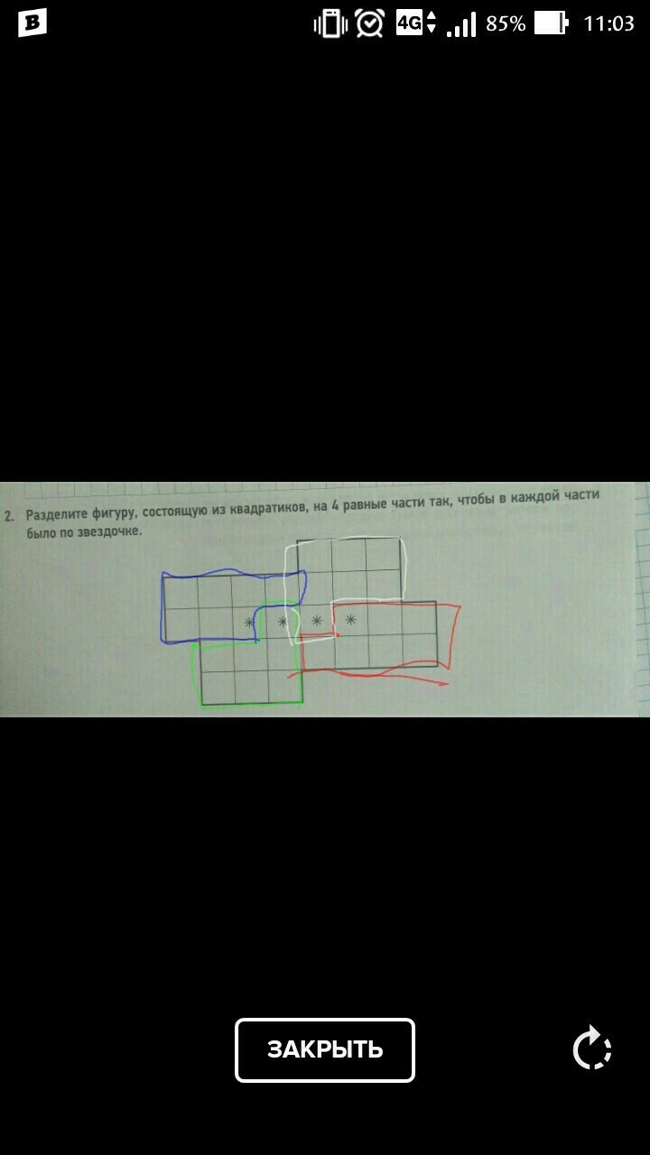 Разделите фигуру, состоящую из квадртиков, на 4 равные части так, чтобы в каждой части было по звёздочке