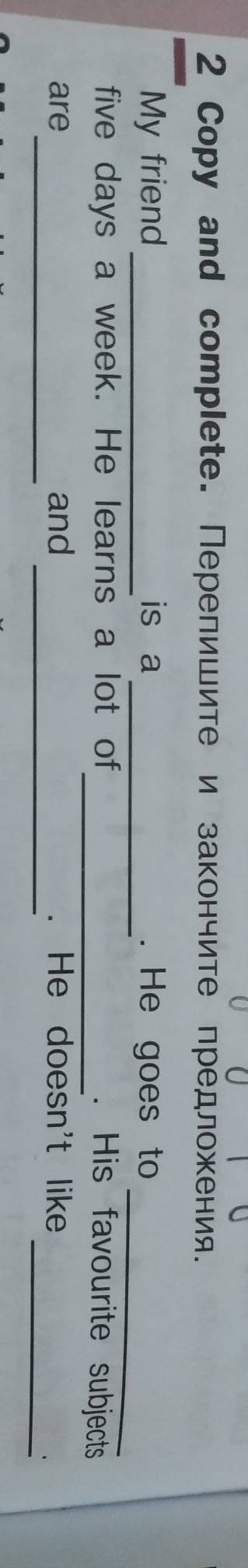 My friend Bob is a student. He goes to school five days a week. He learns a lot of new about our world. His favorite subjects is english lessons and math. He doesn't like biology.