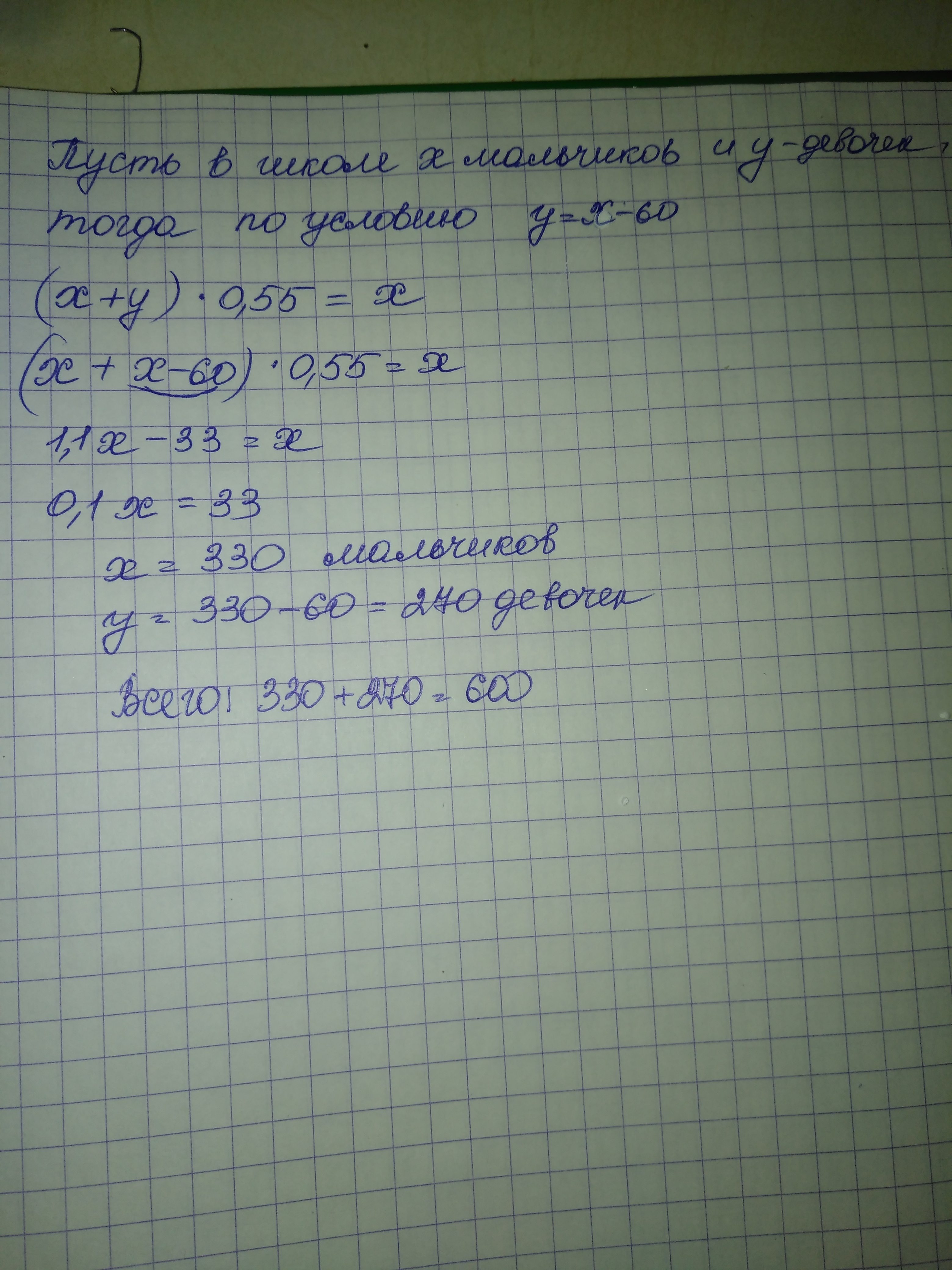 Можно было и так :раз мальчиков 55% , значит девочек 100%-55%=45%; разница составит 55%-45%=10% ,а это 60 человек , значит 100% = 600 человек