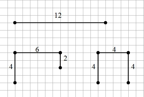 На втором - ломаная, состоящая из трех разных звеньев, общая длина которых - 12 кл.