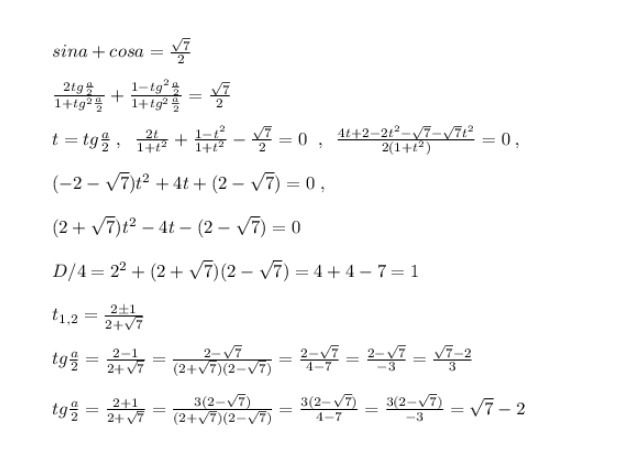 sinx+cosx=sinx=2tg(x/2)/(1+tg^2(x/2))+(1-tg^2(x/2))/(1+tg^2(x/2))=√7/2