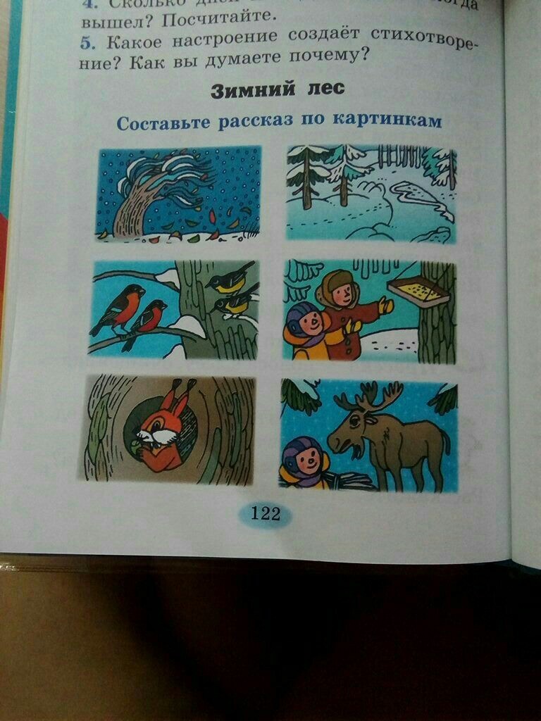 Лес. Вокруг сугробы, похожие большие пухлые подушки. Снегири и ещё пара птиц сидят на ветках одного из деревьев.