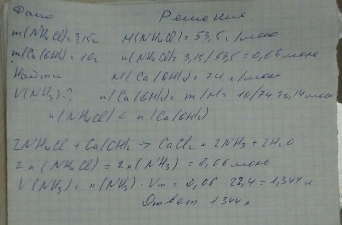 3.15 г хлорида аммония смешали с 10 г гидроксида кальция. Напишите реакцию. Какой газ выделился?