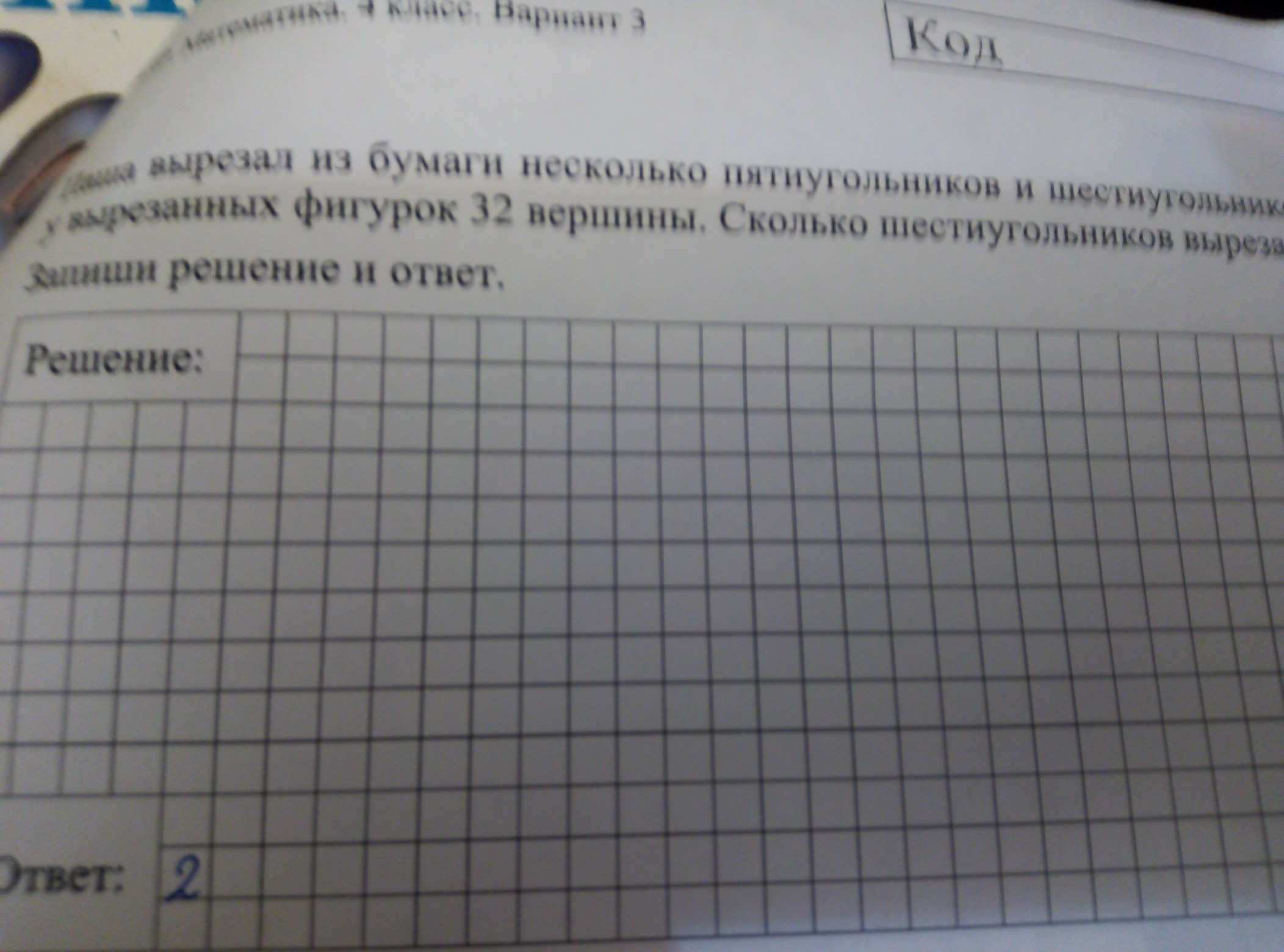 Ответ: Паша вырезал 2 шестиугольника.