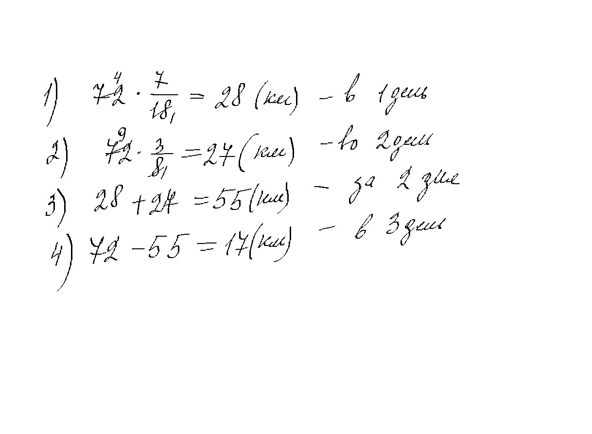 Туристы прошли 72км по местам боевой славы. В 1 - ый день они прошли семь восемнадцатых, во второй день три восьмых всего расстояния. Остальное в третий день.