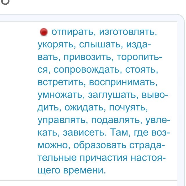 отпираемый, изготовляемый, укоряемый, слышимый, издаваемый,привозимый, -, сопровождаемый, -, -, воспринимаемый, умножаемый, заглушаемый,выводимый, ожидаемый,-, управляемый, подавляемый, увлекаемый, зависимый