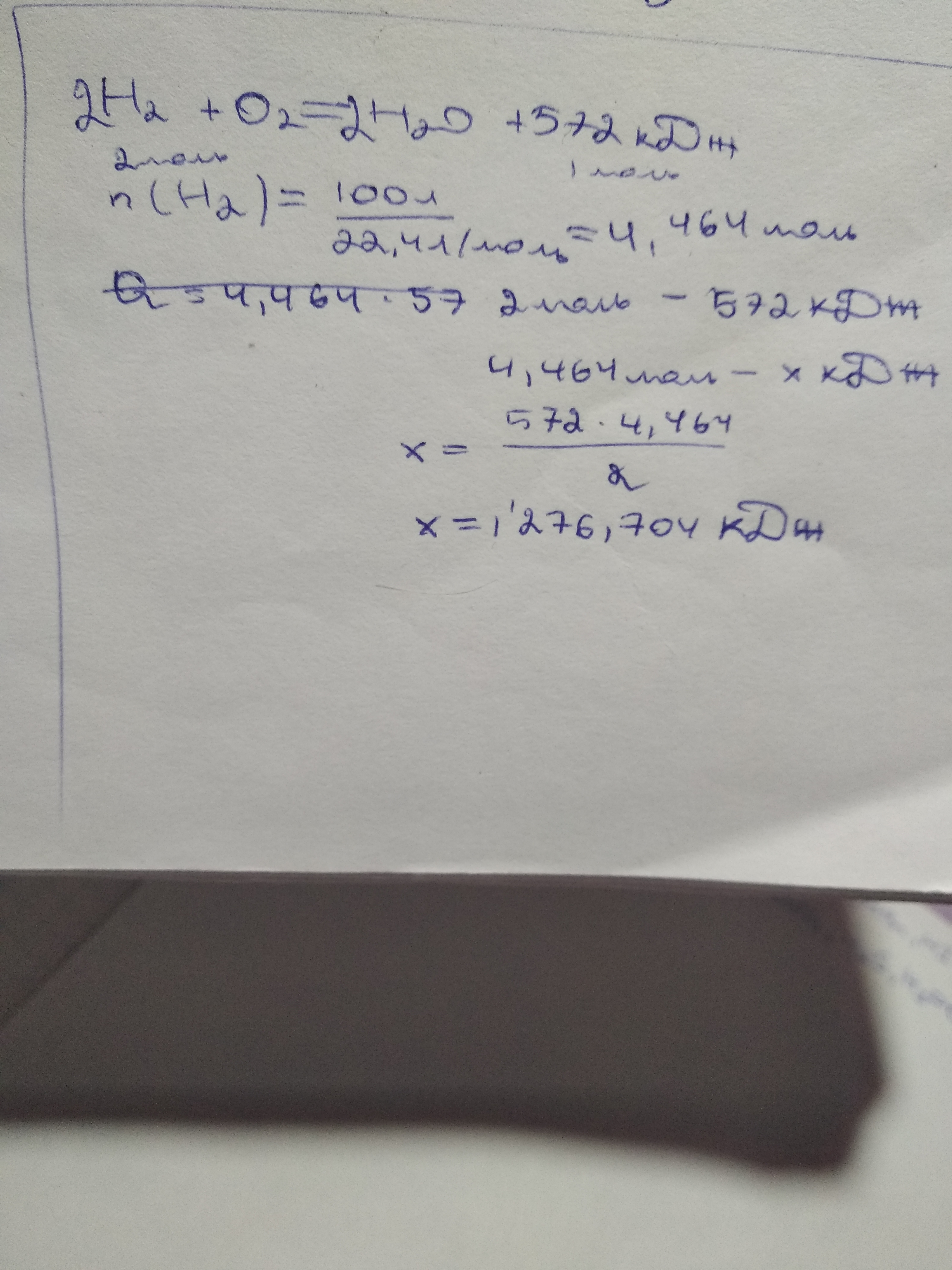 Какое количество теплоты выделится при сжигании 100л водорода, взятого при нормальных условиях? Термо-химическое уравнение реакции: H2(г.) + O2(г.) = H2O(г.) + 572 кДж