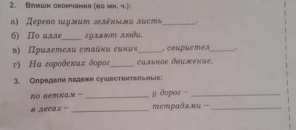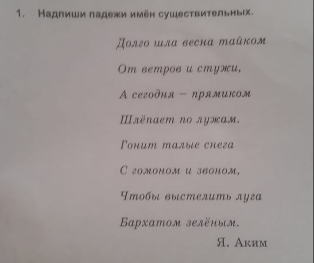 1. Весна(И.п.), ветров(Р.п.), стужи(Р.п.), по лужам(Д.п.), снега(В.п.), с гомоном(Т.п.), звоном(Т.п.), луга(В.п.), бархатом(Т.п.)...2. а) листьЯМИ, б) аллеЯМ, в) синиЧЕК, свиристелЕЙ, г) дорогАХ...3. по веткам(Д.п.), в лесах(П.п.), у дорог(Р.п.), тетрадями(Т.п.).