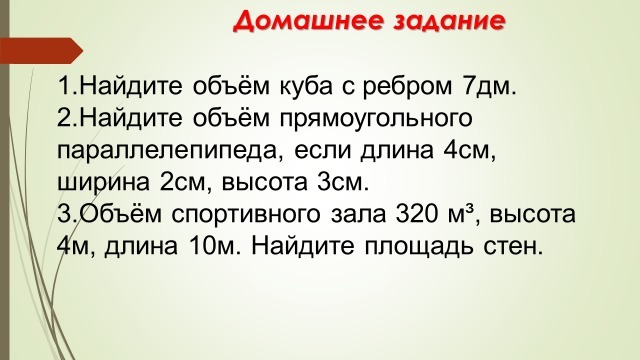 1. V = 7³ = 343 дм³