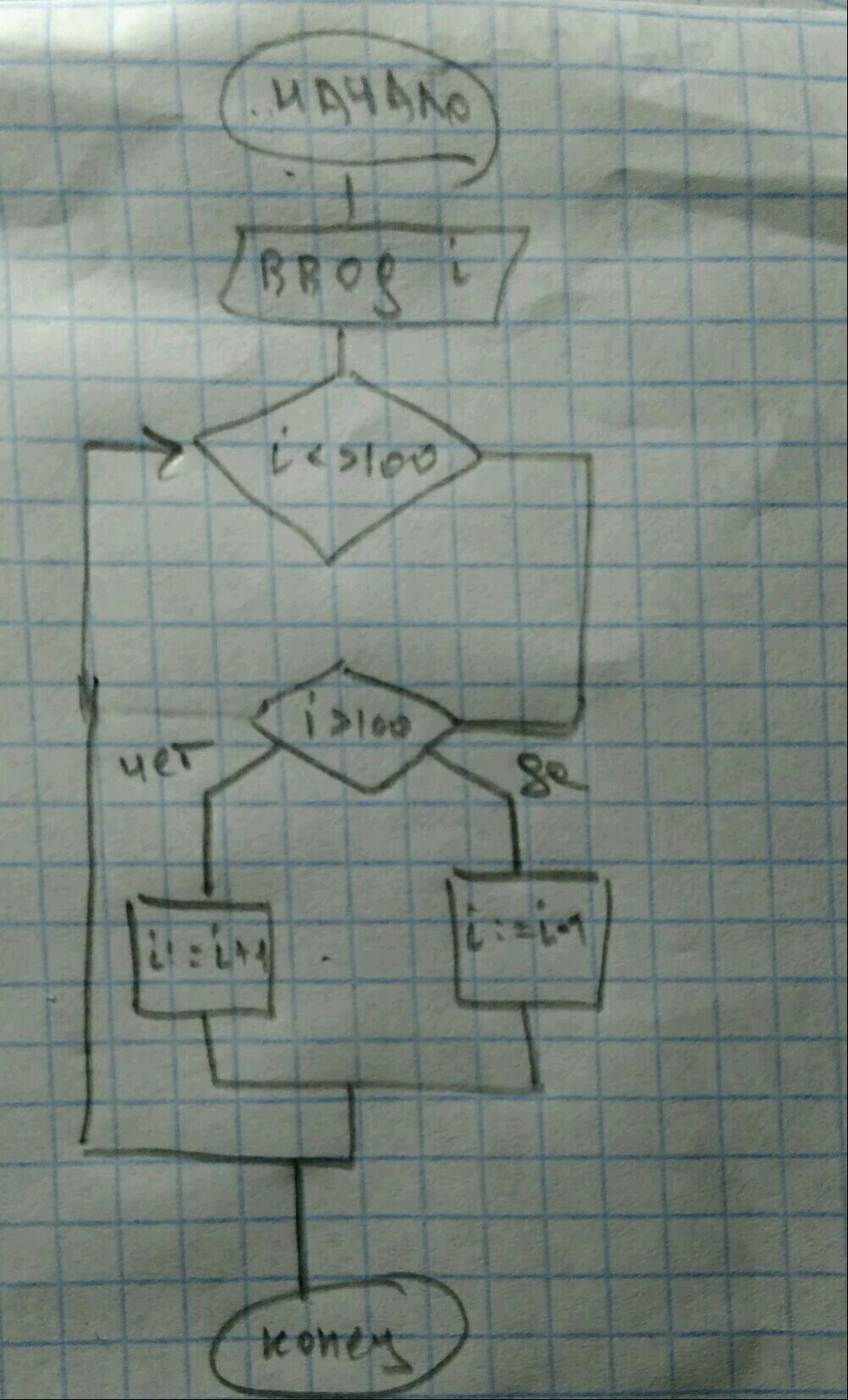 Постройте блок схему алгоритма, который увеличивает или уменьшает введённое число на 1, до тех пор, пока оно не станет равно 100.