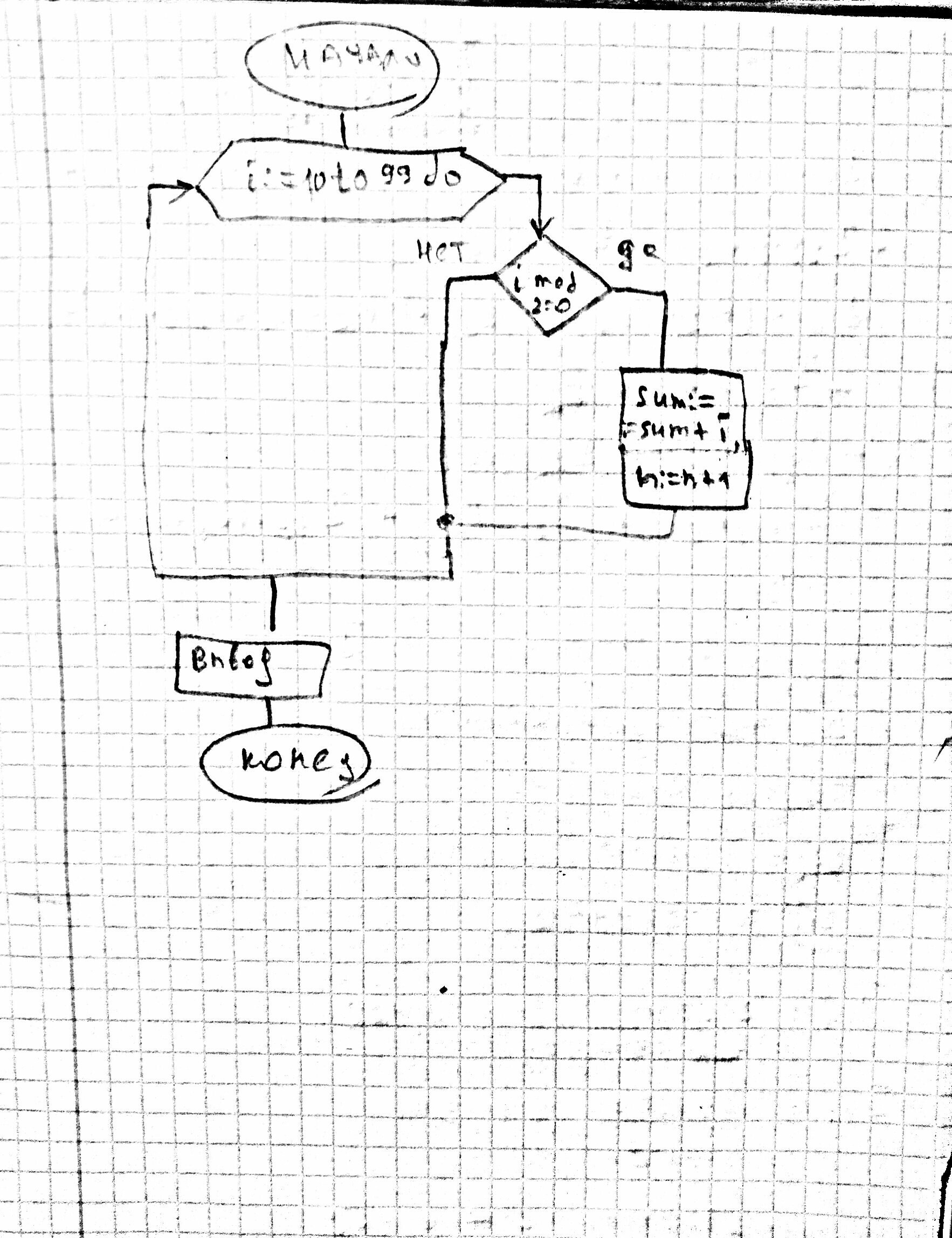 Постройте блок схему алгоритма, который считает и выводит среднее арифметическое всех чётных двузначных чисел.