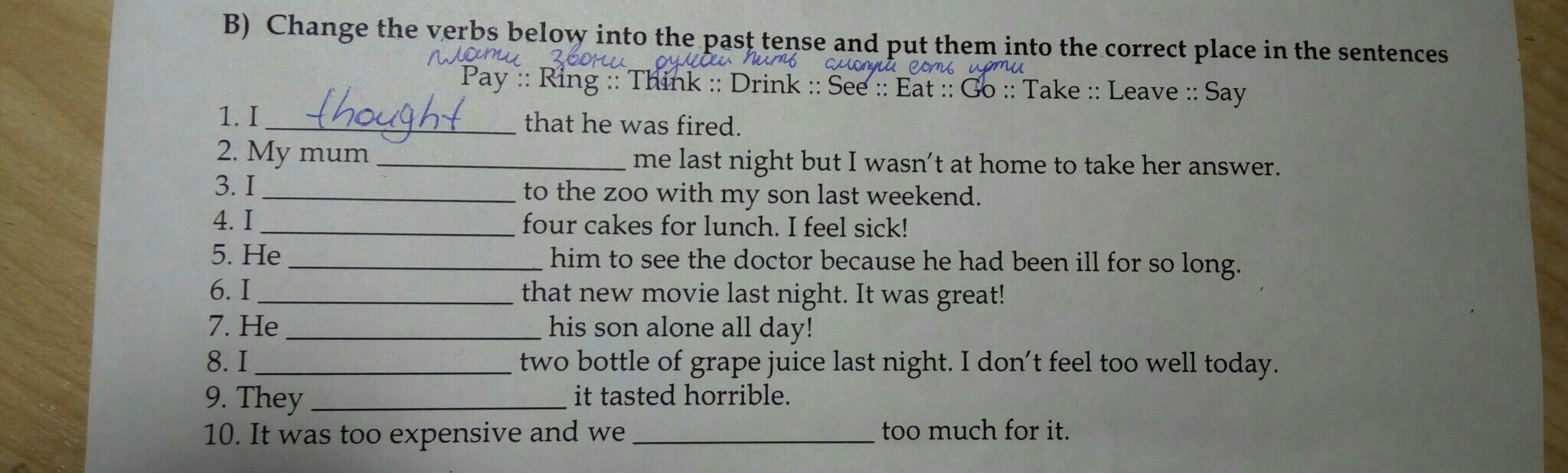 2 rang 3 went 4 ate 5 took 6 saw 7 left 8 drank 9 said 10 paid
