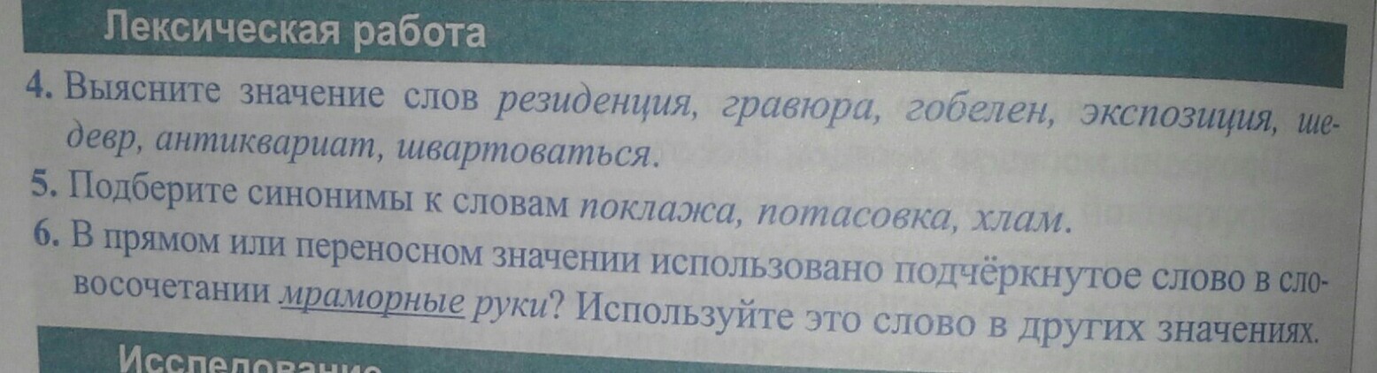 6. Мраморные руки - в переносном значении, то есть они белые как мрамор.