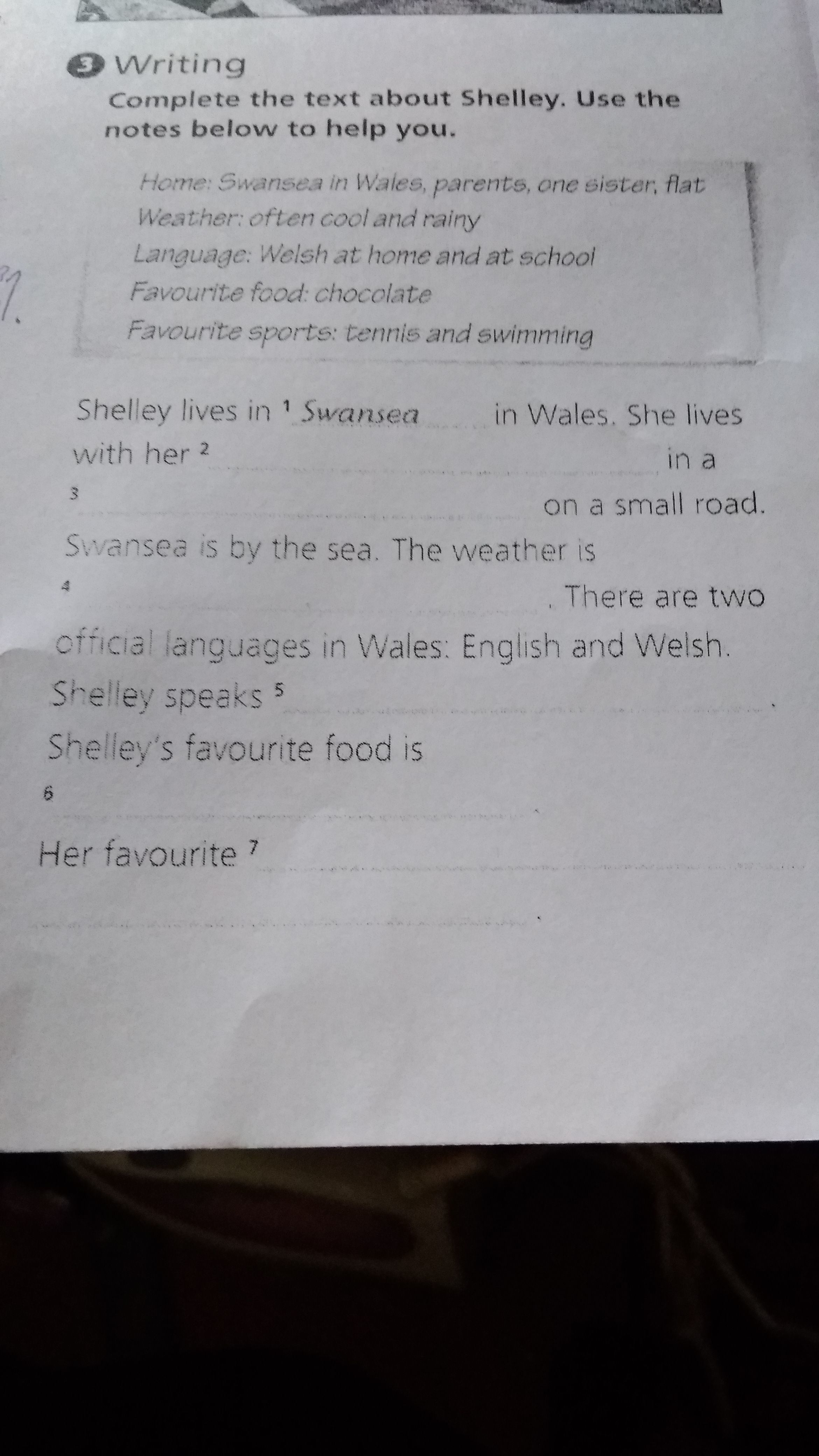 Shelley lives in Swansea in Wales. She lives with her parents and sister in a flat on a small road. Swansea is by the sea. The weather is often cool and rainy. There are two official languages in Wales: English and Welsh. Shelley speaks Welsh at home and at school. Shelley's favourite food is chocolate. Her favourite sports are tennis and swimming.