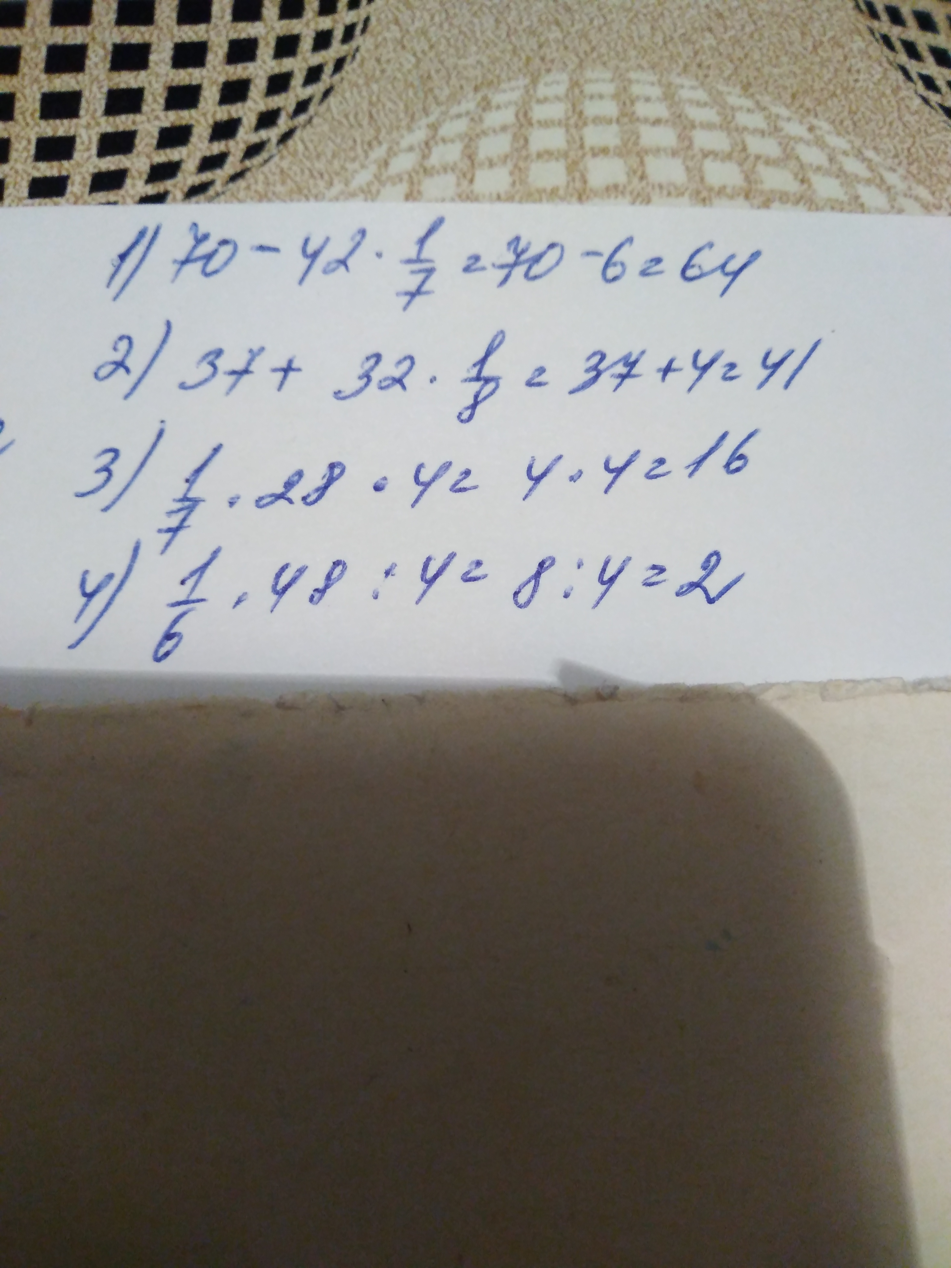 Из числа 70 вычти одну седьмую часть числа 42: