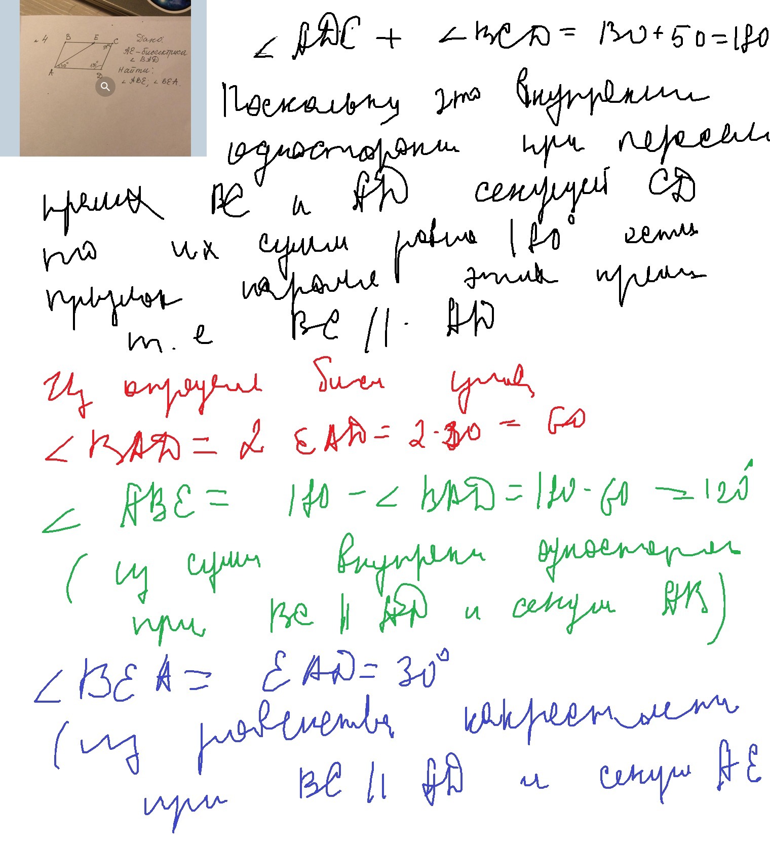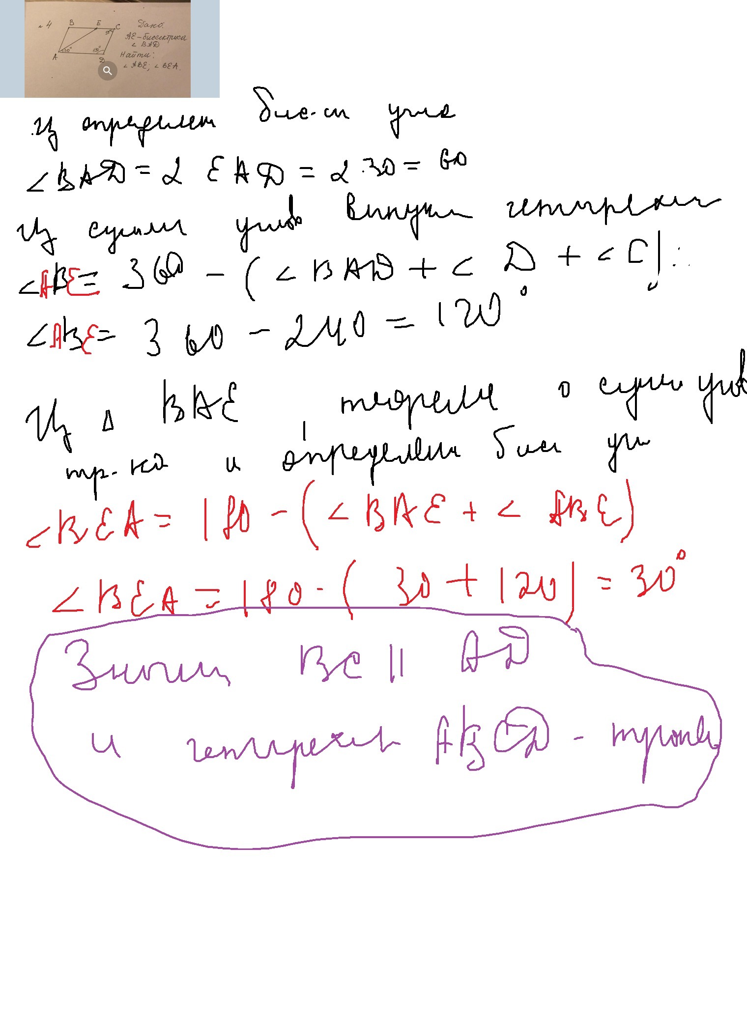 BC║AD, тк внешний угол C (180 - 30) будет равен углу D, следовательно ∠DAE = ∠BEA = 30°.