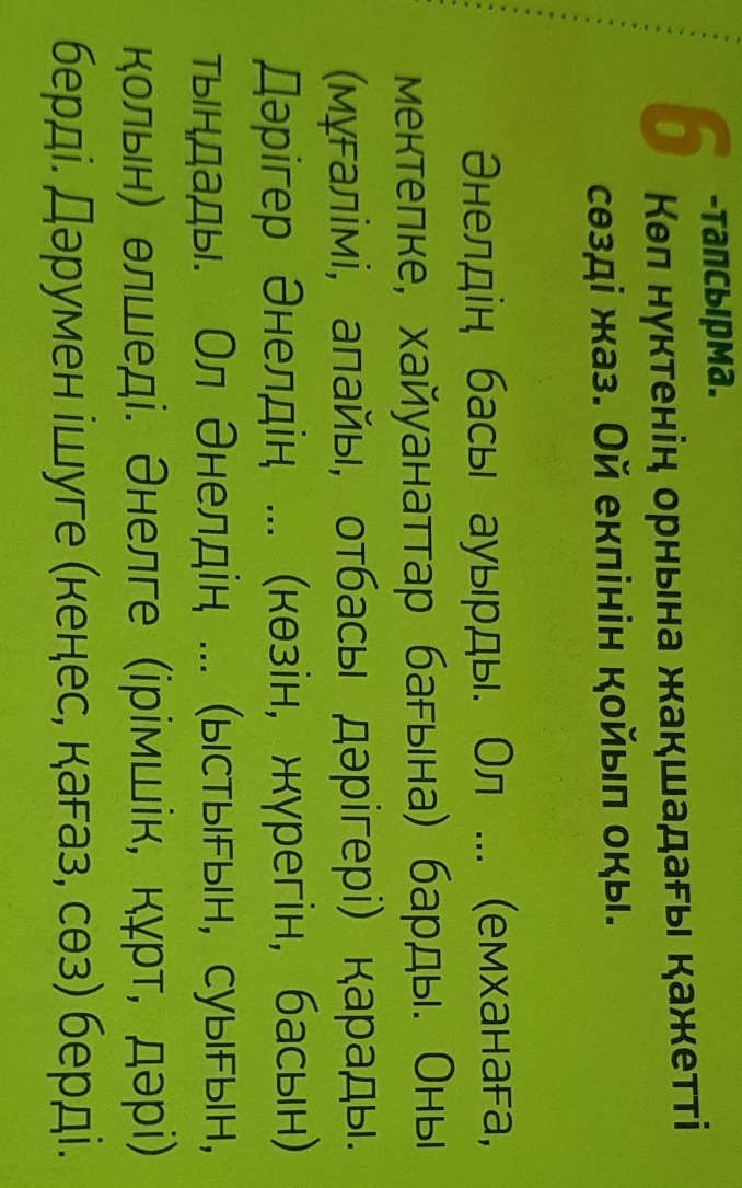 Әнелдің басы ауырды.Ол емханаға барды.Оны отбасы дәрігері қарады.Дәрігер Әнелдің жүрегің тыңдады.Ол Әнелдің ыстығын өлшеді.Әнелге дәрі берді.Дәрумен ішуге кеңес берді.