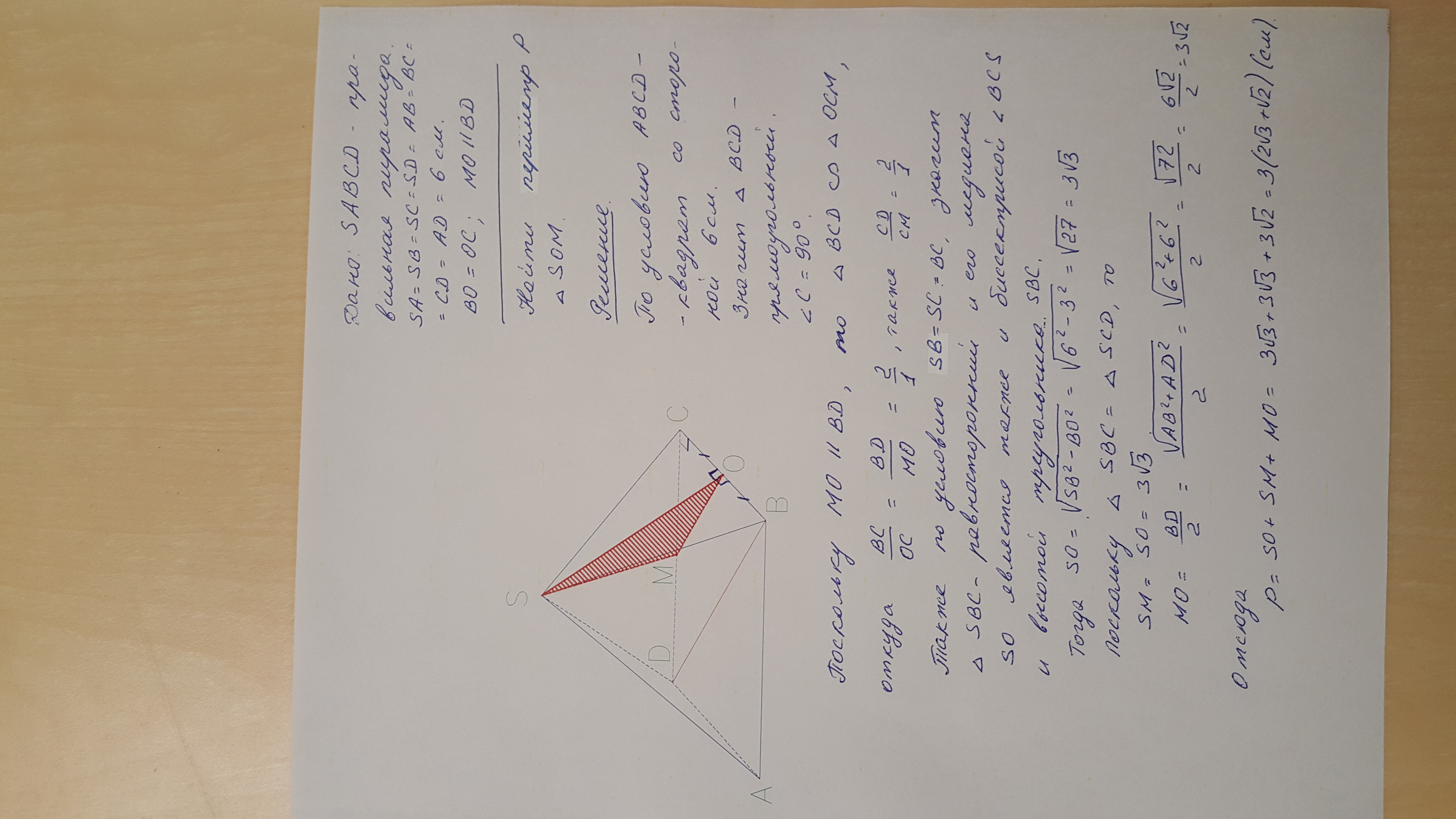 Длинна каждого ребра четырехугольной пирамиды SABCD равна 6 см. Точка O середина ребра BC, постройте сечение пирамиды плоскостью, которая проходит через прямую SO, и параллельна BD. Вычислить периметр этого сечения.