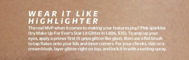 2) Есть MVP, когда дело доходит до создания ваших функций поп? Розовые блестки (попробуйте Make Up For Ever's Star Lit Glitter в L806, $ 35). Чтобы улучшить ваши глаза, сначала нанесите грунтовку, а затем используйте плоскую кисть, чтобы нанести хлопок на веки и внутренние уголки. Чтобы нанести кремовый крем, нанесите блестящий слой прямо сверху и зафиксируйте его с помощью подходящего спрея.