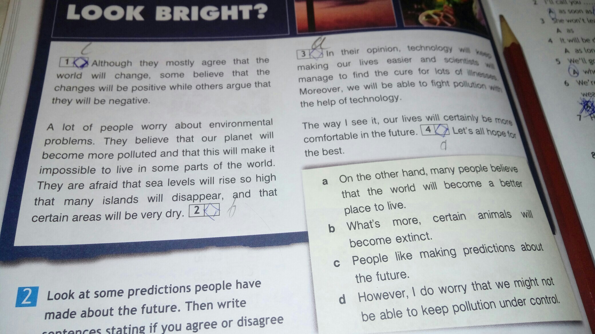 С другой стороны, многие люди считают, что земля станет лучшим местом для жизни. По их мнению, технологии будут делать жизнь ещё проще, а ученые найдут лекарства от многих болезней. Более того, мы сможем бороться с загрязнениями при помощи технологий.