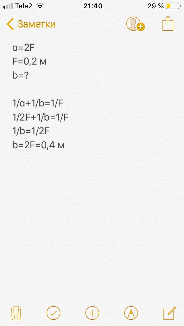 Источник света помещен в двойной фокус собирающей линзы с фокусным расстоянием, равным 0,2 м. На каком расстоянии от линзы находится изображение источника света?