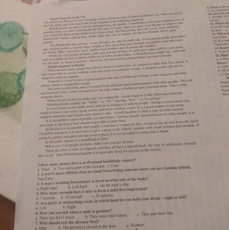 Смотри вообще эти ответы на вопросы требуют твой личный взгляд/мнение потому что в тексте говорится про социальный этикет в Великобритании и в РФ, так что прочитай текст и попробуй по своим взглядам ответить на него, но мои ответы как видишь сверху. Если есть вопросы пиши! Рад помочь!