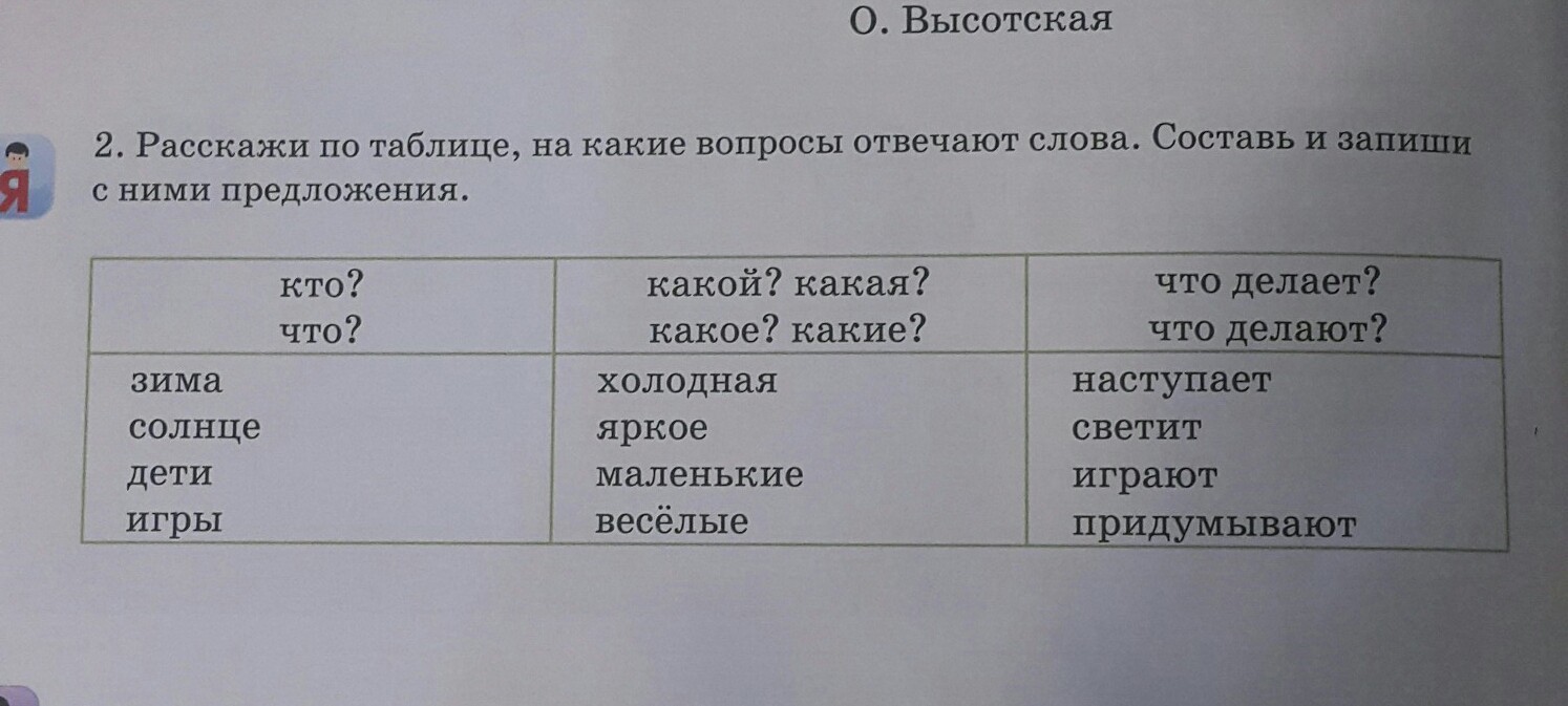 Вопросы из первого столбца определяют предмет. Из второго - признак предмета, а из третьего - его дейтсвие.