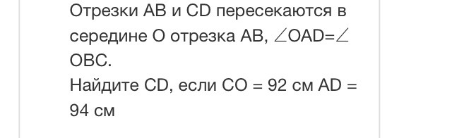 2)Из равенства треугольниковощи следует : CB=AD=94 см,AO=OB, CO=OD=92см